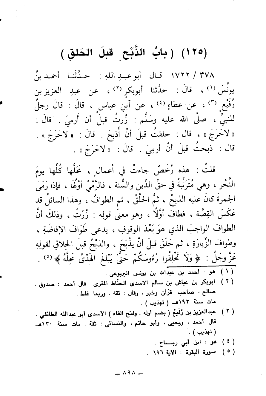 378/ 1722 - قال أبو عبد الله: حدثنا أحمد بن يونس، قال: حدثنا أبو بكر، عن عبد العزيز بن رفيع، عن عطاء، عن ابن عباس قال: قال رجل للنبي صلى الله عليه وسلم: زرت قبل أن أرمي، قال: لا حرج، قال: حلقت قبل أن أذبح، قال: لا حرج، قال: ذبحت قبل أن أرمي، قال: لا حرج.