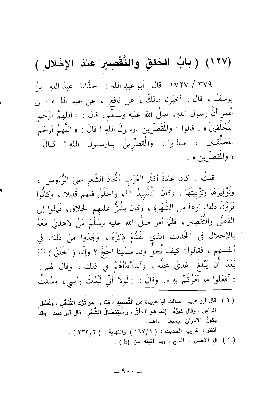 379/ 1727 - قال أبو عبد الله: حدثنا عبد الله بن يوسف، قال: أخبرنا مالك، عن نافع، عن عبد الله بن عمر أن رسول الله صلى الله عليه وسلم قال: (اللهم ارحم المحلقين)، قالوا: والمقصرين يا رسول الله، قال: اللهم ارحم المحلقين، قالوا: والمقصرين يا رسول الله، قال: والمقصرين.