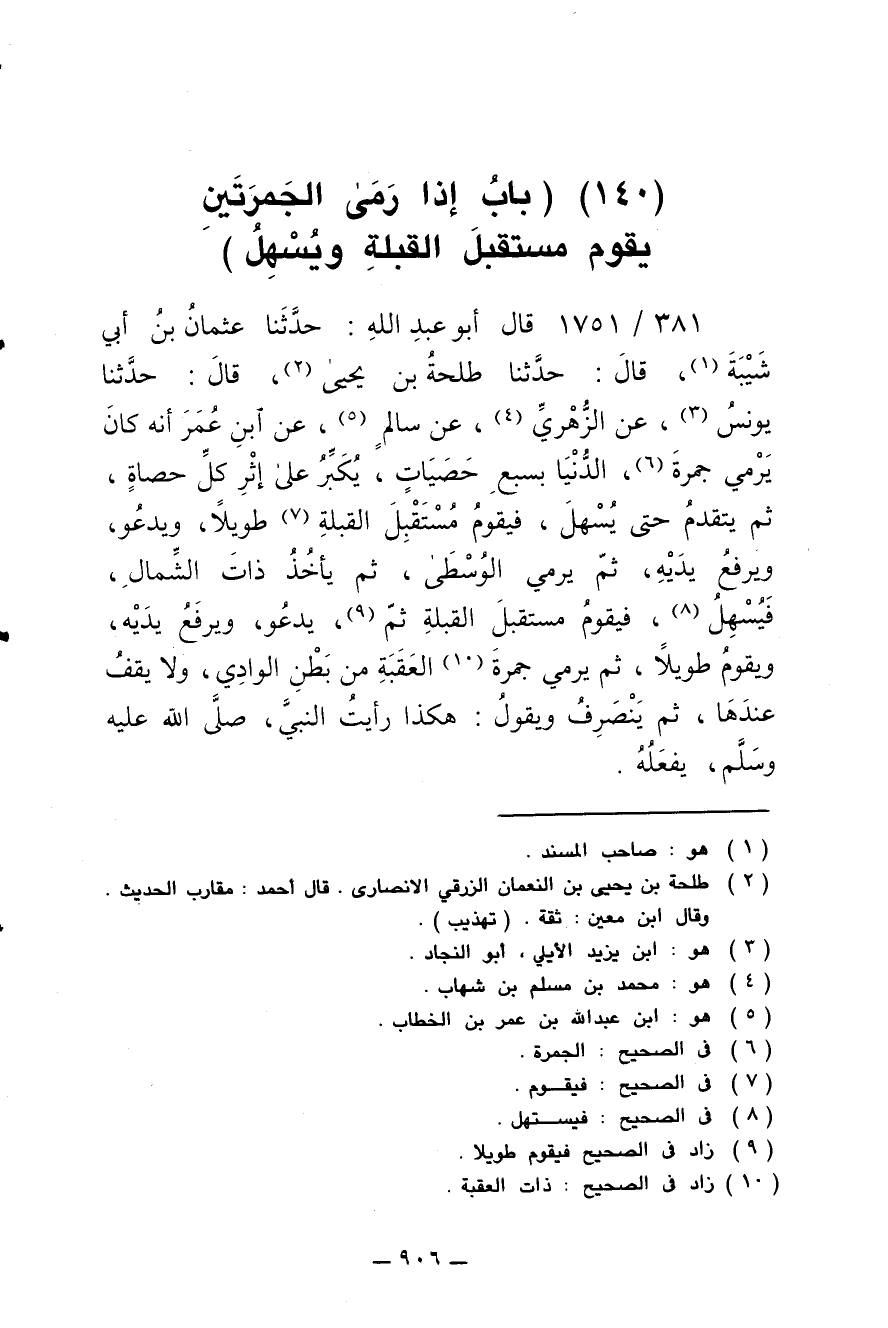 381/ 1751 - قال أبو عبد الله: حدثنا عثمان بن أبي شيبة، قال: حدثنا طلحة بن يحيى، قال: حدثنا يونس، عن الزهري، عن سالم، عن ابن عمر أنه كان يرمي جمرة، الدنيا بسبع حصيات، يكبر على إثر كل حصاة، ثم يتقدم حتى يُسهل، فيقوم مستقبل القبلة طويلا، ويدعو ويرفع يديه، ثم يرمي الوسطى، ثم يأخذ ذات الشمال، فيسهل، فيقوم مستقبل القبلة ثم يدعو، ويرفع يديه، ويقوم طويلا، ثم يرمي جمرة العقبة من بطن الوادي، ولا يقف عندها، ثم ينصرف ويقول: هكذا رأيت النبي صلى الله عليه وسلم يفعله.