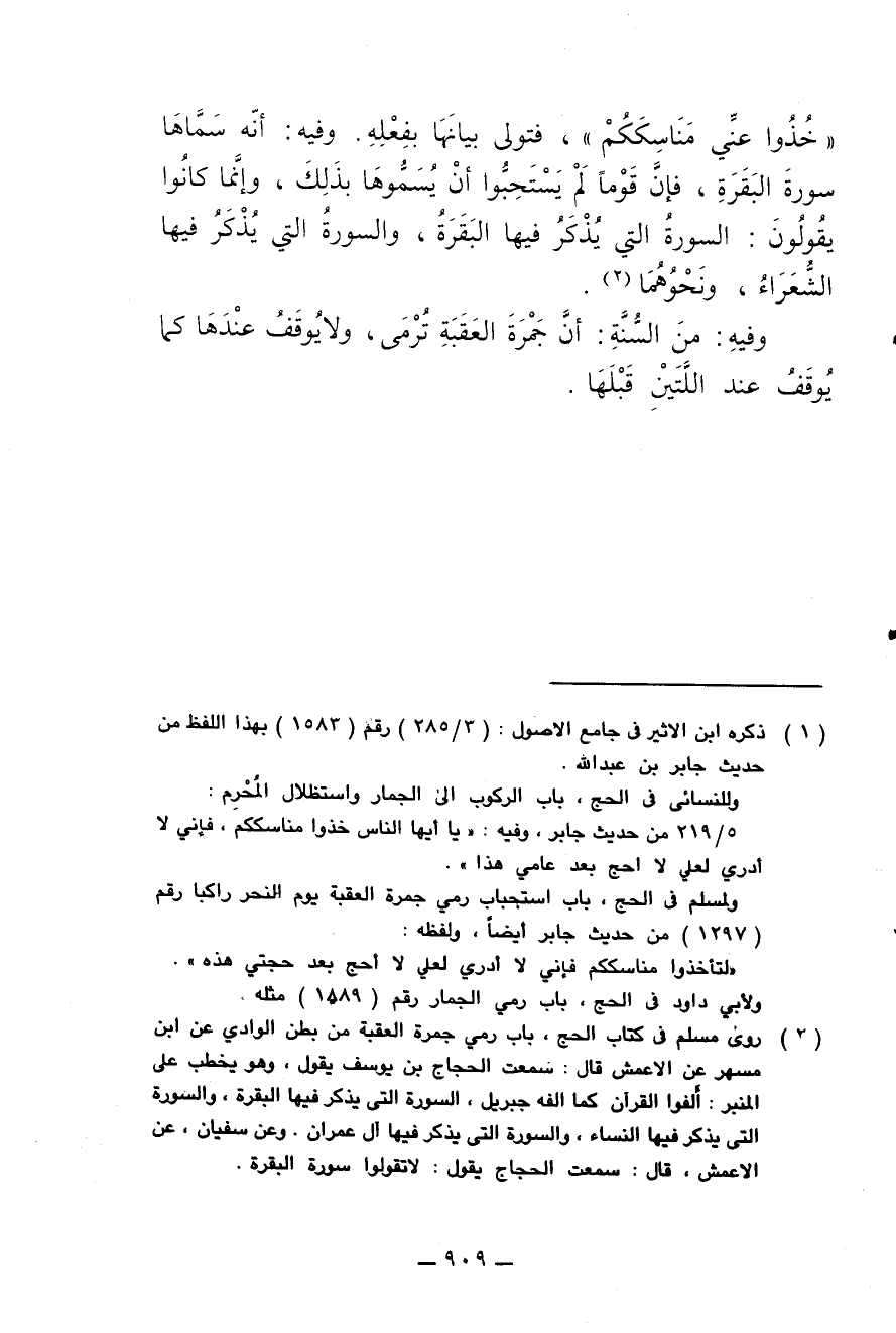 (خذوا عني مناسككم)، فتولى بيانها بفعله. وفيه: أنه سماها سورة البقرة، فإن قوما لم يستحبوا أن يسموها بذلك، وإنما كانوا يقولون: السورة التي يذكر فيها البقرة، والسورة التي يذكر فيها الشعراء، ونحوهما.