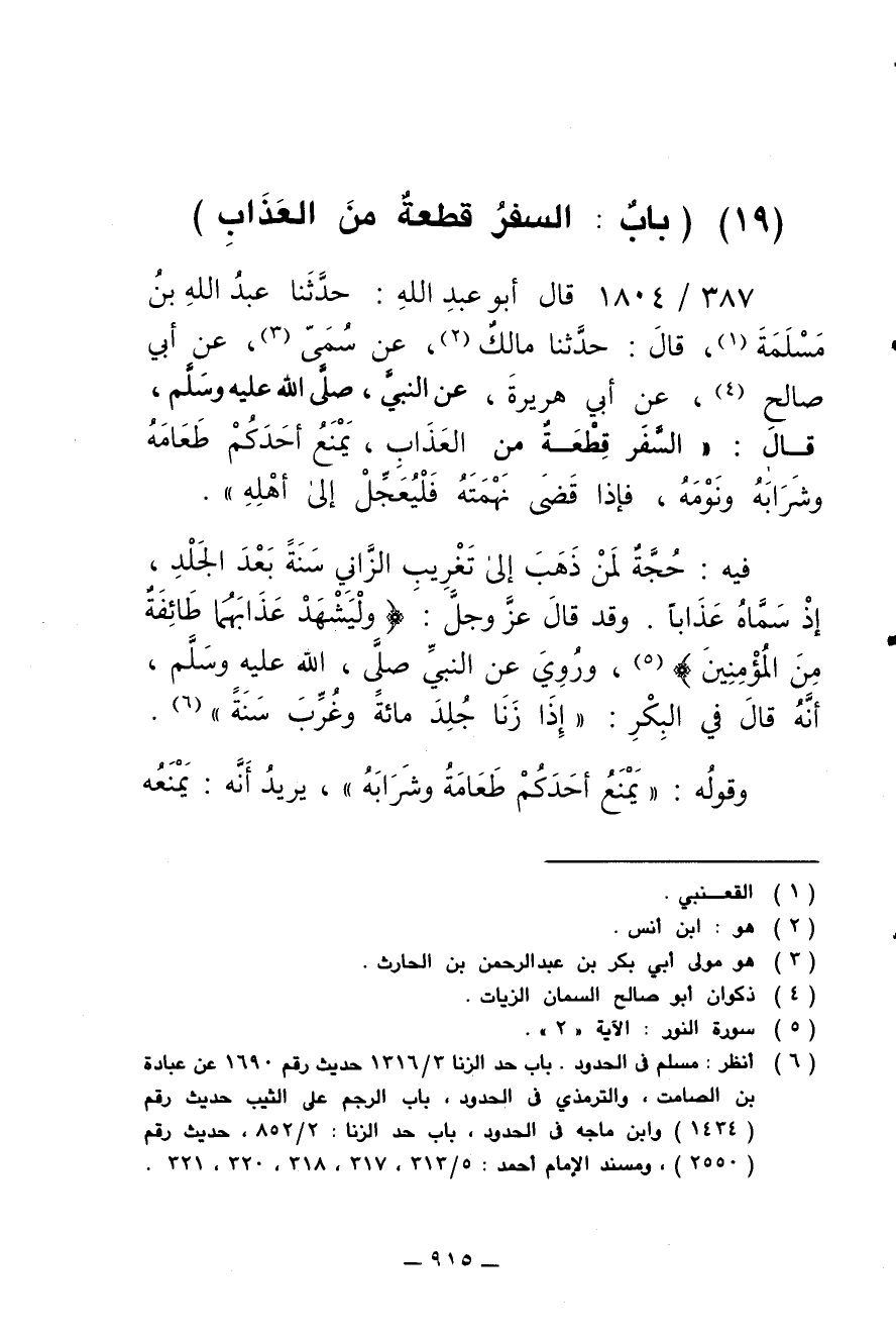 387/ 1804 - قال أبو عبد الله: حدثنا عبد الله بن مسلمة، قال: حدثنا مالك، عن سمي، عن أبي صالح، عن أبي هريرة، عن النبي صلى الله عليه وسلم، قال: (السفر قطعة من العذاب، يمنع أحدكم طعامه وشرابه ونومه، فإذا قضى نهمته فليعجل إلى أهله).