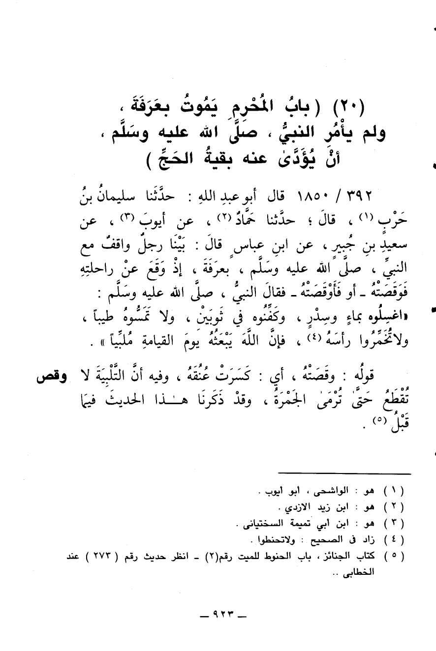 392/ 1850 - قال أبو عبد الله: حدثنا سليمان بن حرب، قال: حدثنا حماد، عن أيوب، عن سعيد بن جبير، عن ابن عباس قال: بينا رجل واقف مع النبي صلى الله عليه وسلم بعرفة، إذ وقع عن راحلته، فوقصته -أو فأوقصته- فقال النبي صلى الله عليه وسلم: (اغسلوه بماء وسدر، وكفنوه في ثوبين، ولا تمسوه طيبا، ولا تخمروا رأسه، فإن الله يبعثه يوم القيامة ملبيا).