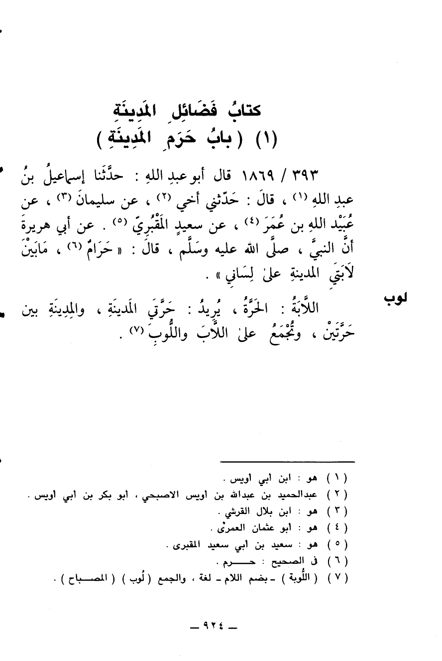 393/ 1869 - قال أبو عبد الله: حدثنا إسماعيل بن عبد الله، قال: حدثني أخي، عن سليمان، عن عبيد بن عمير، عن سعيد المقبري عن أبي هريرة أن النبي صلى الله عليه وسلم قال: (حرام ما بين لابتي المدينة على لساني).