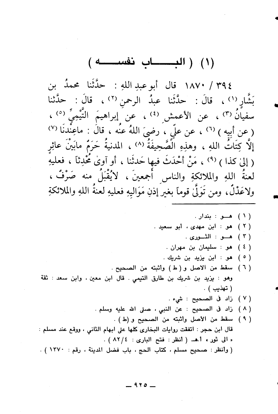 394/ 1870 - قال أبو عبد الله: حدثنا محمد بن بشار، قال: حدثنا عبد الرحمن، قال: حدثنا سفيان، عن الأعمش، عن إبراهيم التيمي، (عن أبيه) عن علي رضي الله عنه قال: ما عندنا إلا كتاب الله وهذه الصحيفة، المدينة حرم ما بين عائر (إلى كذا)، من أحدث فيها حدثنا [حدثا] أو آوى محدثا، فعليه لعنة الله والملائكة والناس أجمعين، لا يقبل منه صرف ولا عدل، ومن تولى قوما بغير إذن مواليه فعليه لعنة الله والملائكة