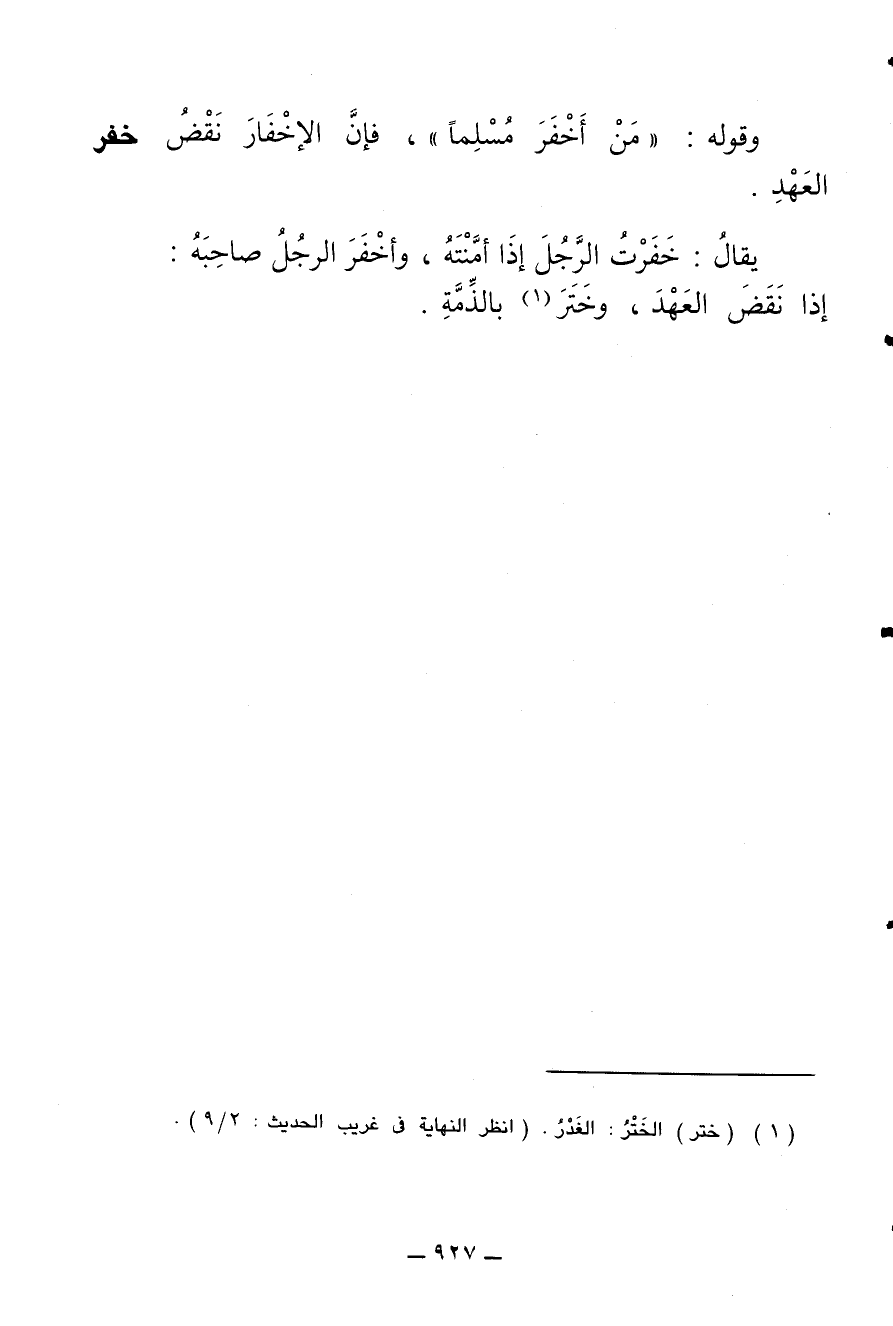 يقال: خفرت الرجل إذا أمنته، وأخفر الرجل صاحبه: إذا نقض العهد، وختر بالذمة.