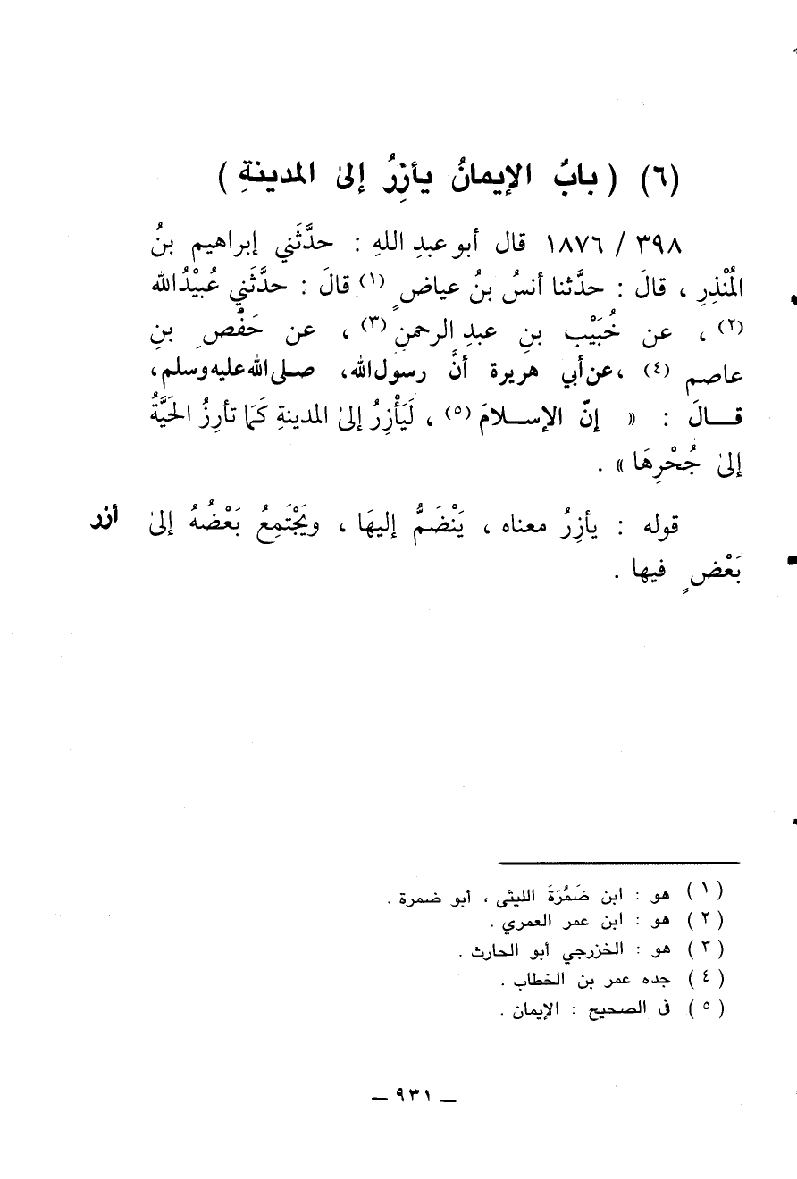 398/ 1876 - قال أبو عبد الله: حدثني إبراهيم بن المنذر، قال: حدثنا أنس بن عياض، قال: حدثني عبيد الله، عن خبيب بن عبد الرحمن، عن حفص بن عاصم، عن أبي هريرة أن رسول الله صلى الله عليه وسلم قال: (إن الإسلام ليأزر [ليأرز] إلى المدينة كما تأرز الحية إلى جحرها).