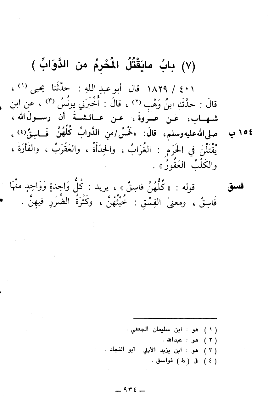 401/ 1829 - قال أبو عبد الله: حدثنا يحيى قال: حدثنا ابن وهب، قال: أخبرني يونس، عن ابن شهاب، عن عروة، عن عائشة أن رسول الله صلى الله عليه وسلم قال: (خمس من الدواب كلهن فاسق، يقتلن في الحرم: الغراب، والحدأة، والعقرب، والفأرة، والكلب العقور).