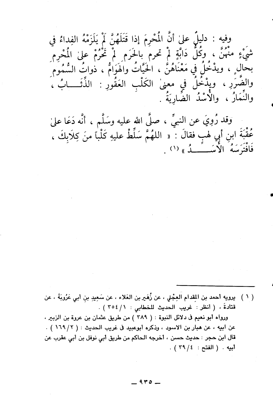 وفيه دليل على أن المحرم إذا قتلهن لم يلزمه الفداء في شيء منهن، وكل دابة لم تحرم بالحرم لم تحرم على المحرم بحال، ويدخل في معناهن: الحيات والهوام، ذوات السموم والضرر، ويدخل في معنى الكلب العقور: الذئاب، والنمار والأسد الضارية.