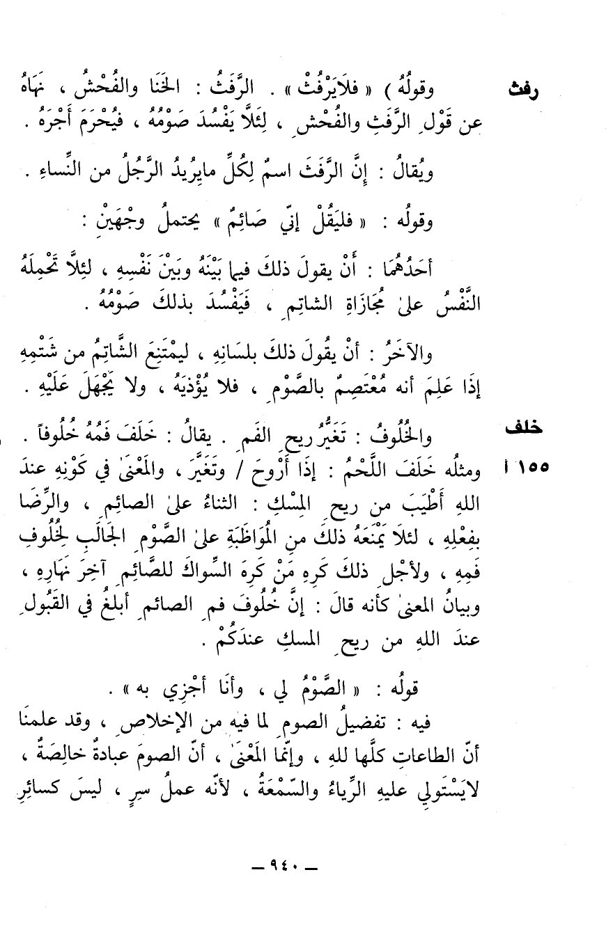 وقوله: (فلا يرفث). الرفث: الخنا والفحش، نهاه عن قول الرفث والفحش، لئلا يفسد صومه فيحرم أجره.