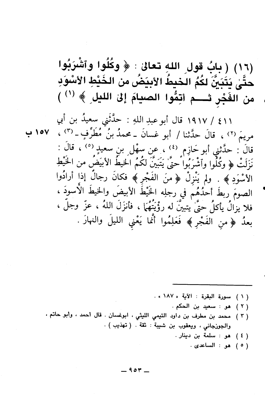 411/ 1917 - قال أبو عبد الله: حدثني سعيد بن أبي مريم قال: حدثنا أبو غسان -محمد بن مطرف- قال: حدثني أبو حازم، عن سهل بن سعيد [سعد] قال: نزلت {وكلوا واشربوا حتى يتبين لكم الخيط الأبيض من الخيط الأسود} ولم ينزل {من الفجر} فكان رجال إذا أرادوا الصوم ربط أحدهم في رجله الخيط الأبيض والخيط الأسود، فلا يزال يأكل حتى يتبين له رؤيتهما، فأنزل الله عز وجل بعد {من الفجر} فعلموا أنما يعني الليل والنهار.