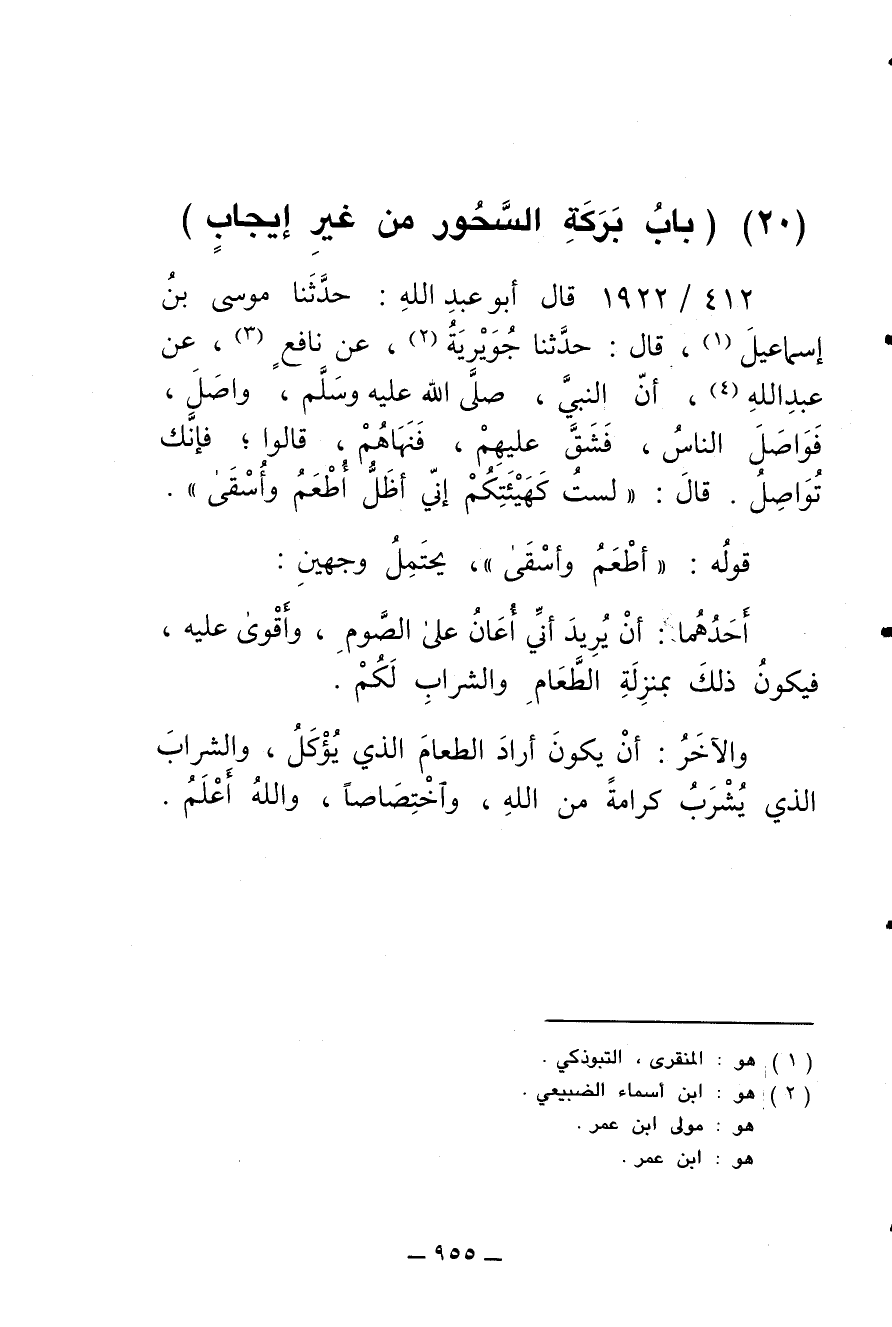412/ 1922 - قال أبو عبد الله: حدثنا موسى بن إسماعيل، قال: حدثنا جويرية، عن نافع، عن عبد الله، أن النبي صلى الله عليه وسلم واصل، فواصل الناس، فشق عليهم، فنهاهم، قالوا: فإنك تواصل، قال: (لست كهيئتكم إني أظل أطعم وأسقى).