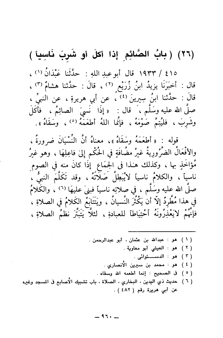 415/ 1933 - قال أبو عبد الله: حدثنا عبدان، قال: أخبرنا يزيد بن زريع، قال: حدثنا هشام، قال: حدثنا ابن سيرين، عن أبي هريرة عن النبي صلى الله عليه وسلم قال: (إذا نسي الصائم فأكل وشرب، فليتم صومه، فإنما الله أطعمه وسقاه).