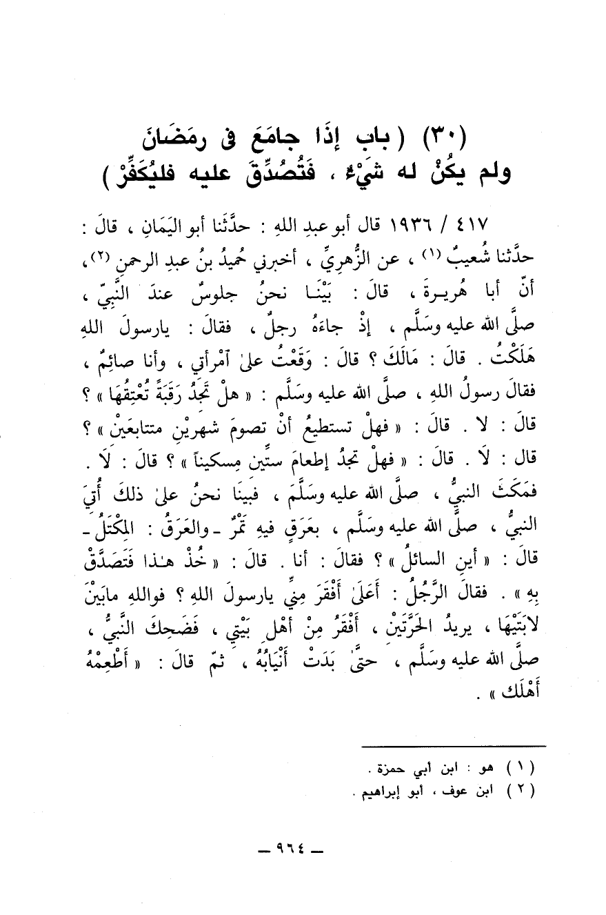 417/ 1936 - قال أبو عبد الله: حدثنا أبو اليمان، قال: حدثنا شعيب، عن الزهري، أخبرني حميد بن عبد الرحمن أن أبا هريرة، قال: بينا نحن جلوس عند النبي صلى الله عليه وسلم، إذ جاءه رجل، فقال: يا رسول الله هلكت. قال: ما لك؟ قال: وقعت على امرأتي وأنا صائم، فقال رسول الله صلى الله عليه وسلم: (هل تجد رقبة تعتقها؟) قال: لا. قال: (فهل تستطيع أن تصوم شهرين متتابعين؟) قال: لا. قال: (فهل تجد إطعام ستين مسكينا؟) قال: لا. فمكث النبي صلى الله عليه وسلم، فبينا نحن على ذلك أتي النبي صلى الله عليه وسلم بعرق فيه تمر، والعرق: المكتل. قال: أين السائل؟ فقال: أنا. قال: خذ هذا فتصدق به. فقال الرجل: أعلى أفقر مني يا رسول الله؟ فوالله ما بين لابتيها، يريد الحرتين، أفقر من أهل بيتي، فضحك النبي صلى الله عليه وسلم، حتى بدت أنيابه، ثم قال: أطعمه أهلك.