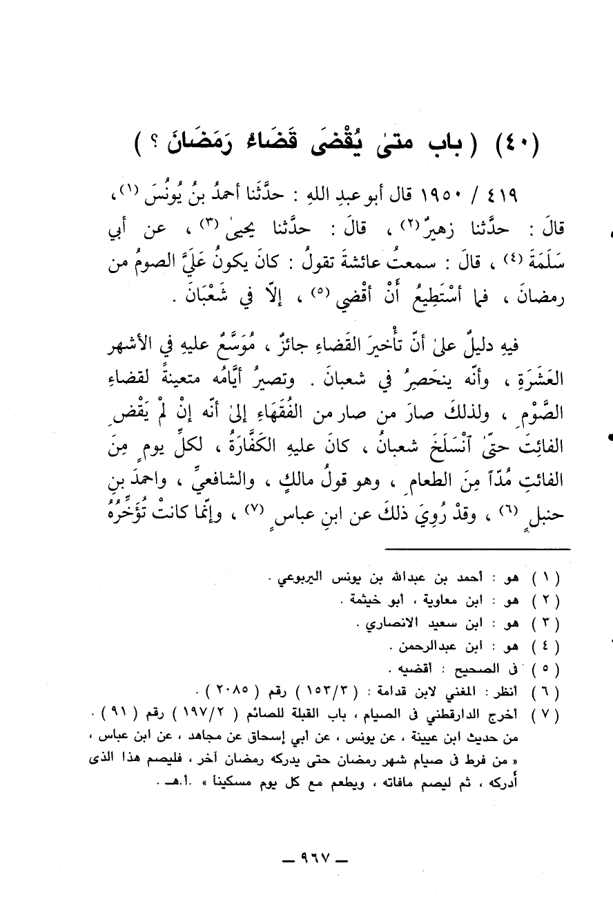 419/ 1950 - قال أبو عبد الله: حدثنا أحمد بن يونس، قال: حدثنا زهير، قال: حدثنا يحيى، عن أبي سلمة، قال: سمعت عائشة تقول: كان يكون علي الصوم من رمضان، فما أستطيع أن أقضي إلا في شعبان.