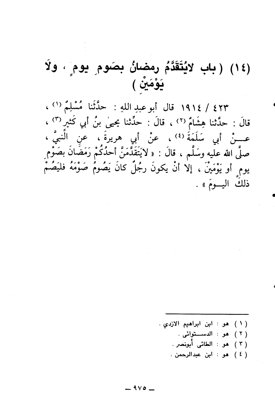 423/ 1914 - قال أبو عبد الله: حدثنا مسلم، قال: حدثنا هشام، قال: حدثنا يحيى بن أبي كثير، عن أبي سلمة، عن أبي هريرة، عن النبي صلى الله عليه وسلم قال: (لا يتقدمن أحدكم رمضان بصوم يوم أو يومين، إلا أن يكون رجل كان يصوم صومه فليصم ذلك اليوم).