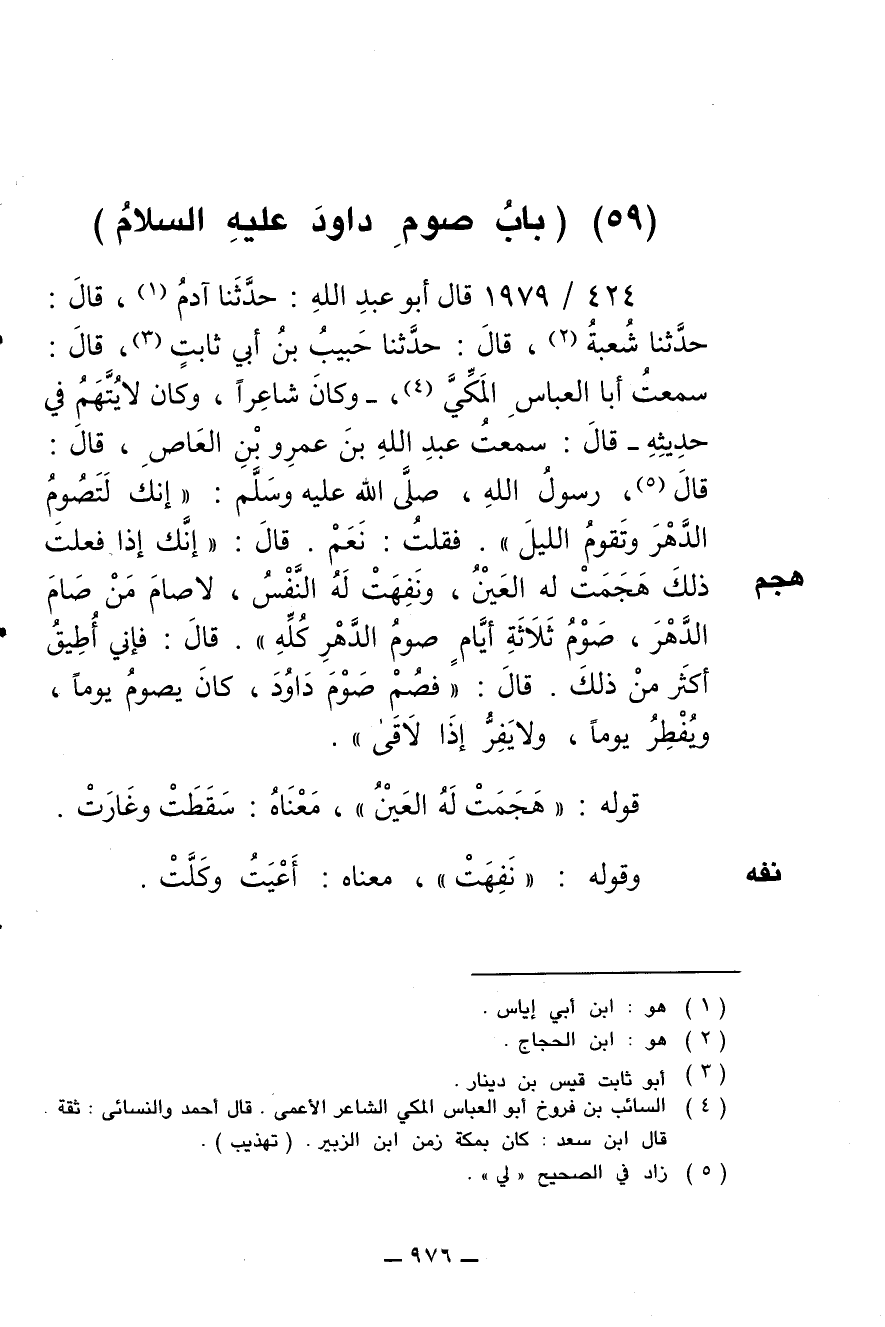 424/ 1979 - قال أبو عبد الله: حدثنا آدم، قال: حدثنا شعبة، قال: حدثنا حبيب بن أبي ثابت، قال: سمعت أبا العباس المكي -وكان شاعرا، وكان لا يتهم في حديثه- قال: سمعت عبد الله بن عمرو بن العاص، قال: قال رسول الله صلى الله عليه وسلم: (إنك لتصوم الدهر وتقوم الليل). فقلت: نعم، قال: (إنك إذا فعلت ذلك هجمت له العين، ونفهت له النفس، لا صام من صام الدهر، صوم ثلاثة أيام صوم الدهر كله). قال: فإني أطيق أكثر من ذلك. قال: (فصم صوم داود، كان يصوم يوما ويفطر يوما، ولا يفر إذا لاقى).