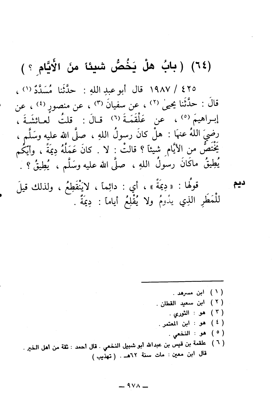 425/ 1987 - قال أبو عبد الله: حدثنا مسدد، قال: حدثنا يحيى، عن سفيان، عن منصور، عن إبراهيم عن علقمة قال: قلت لعائشة رضي الله عنها: هل كان رسول الله صلى الله عليه وسلم يختص من الأيام شيئا؟ قالت: لا. كان عمله ديمة، وأيكم يطيق ما كان رسول الله صلى الله عليه وسلم يطيق؟