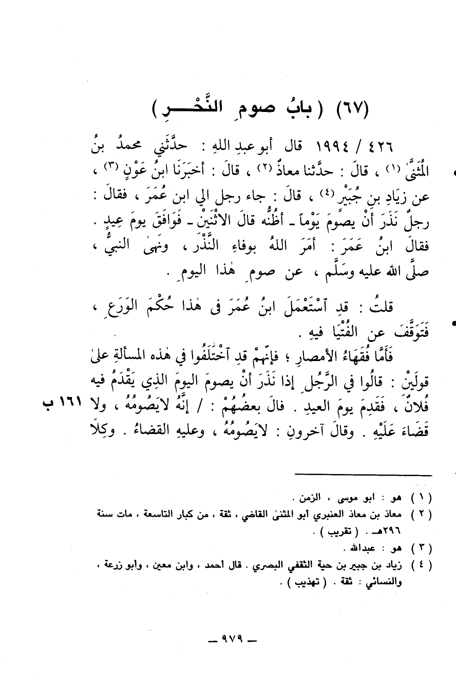 426/ 1994 - قال أبو عبد الله: حدثني محمد بن المثنى، قال: حدثنا معاذ، قال: أخبرنا ابن عون، عن زياد بن جبير، قال: جاء رجل إلى ابن عمر، فقال: رجل نذر أن يصوم يوما -أظنه قال الاثنين- فوافق يوم عيد. فقال ابن عمر: أمر الله بوفاء النذر، ونهى النبي صلى الله عليه وسلم عن صوم هذا اليوم.