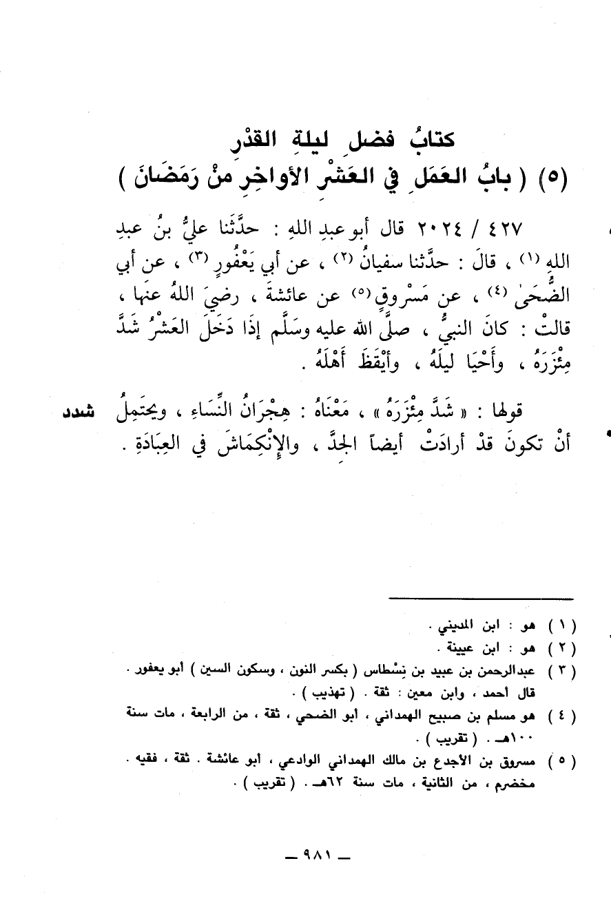 427/ 2024 - قال أبو عبد الله: حدثنا علي بن عبد الله، قال: حدثنا سفيان، عن أبي يعفور، عن أبي الضحى، عن مسروق عن عائشة رضي الله عنها قالت: كان النبي صلى الله عليه وسلم إذا دخل العشر شد مئزره وأحيا ليله وأيقظ أهله.
