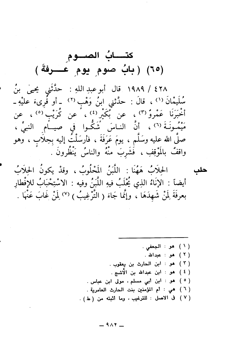428/ 1989 - قال أبو عبد الله: حدثني يحيى بن سليمان، قالك حدثني ابن وهب -أو قرئ عليه- أخبرنا عمرو، عن بكير، عن كريب، عن ميمونة أن الناس شكوا في صيام النبي صلى الله عليه وسلم يوم عرفة، فأرسلت إليه بحلاب، وهو واقف بالموقف، فشرب منه والناس ينظرون.