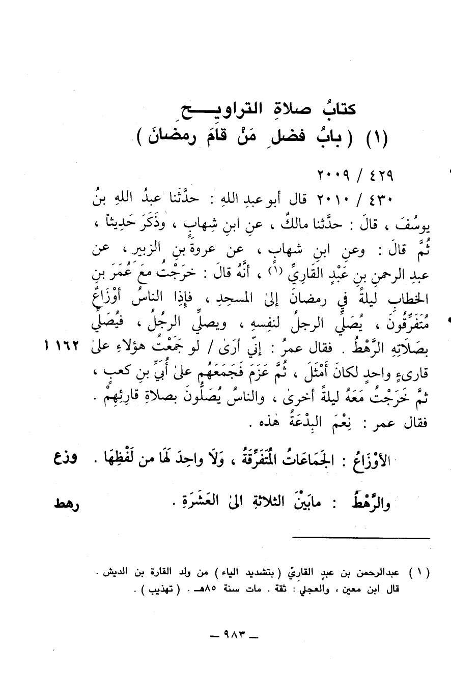 430/ 2010 - قال أبو عبد الله: حدثنا عبد الله بن يوسف، قال: حدثنا مالك، عن ابن شهاب، وذكر حديثا ثم قال: وعن ابن شهاب، عن عروة بن الزبير، عن عبد الرحمن بن عبد القاري، أنه قال: خرجت مع عمر بن الخطاب ليلة في رمضان إلى المسجد، فإذا الناس أوزاع متفرقون، يصلي الرجل لنفسه، ويصلي الرجل فيصلي بصلاته الرهط. فقال عمر: إني أرى لو جمعت هؤلاء على قارئ واحد لكان أمثل، ثم عزم فجمعهم على أبي بن كعب، ثم خرجت معه ليلة أخرى والناس يصلون بصلاة قارئهم. فقال عمر: نعم البدعة هذه.