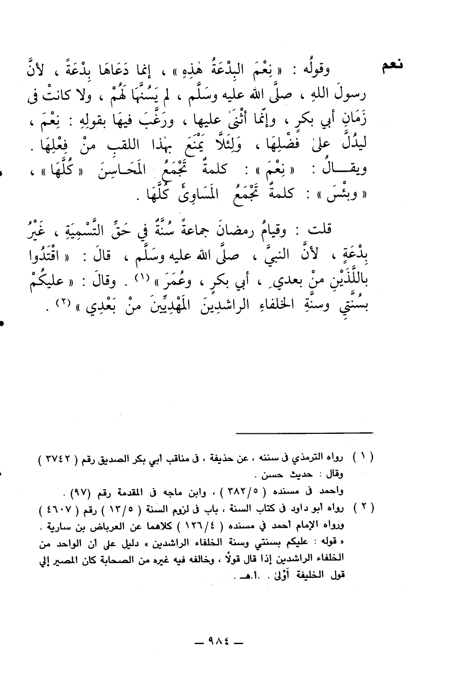 قلت: وقيام رمضان جماعة سنة في حق التسمية، غير بدعة، لأن النبي صلى الله عليه وسلم قال: (اقتدوا باللذين من بعدي أبي بكر وعمر)، وقال: (عليكم بسنتي وسنة الخلفاء الراشدين المهديين من بعدي).