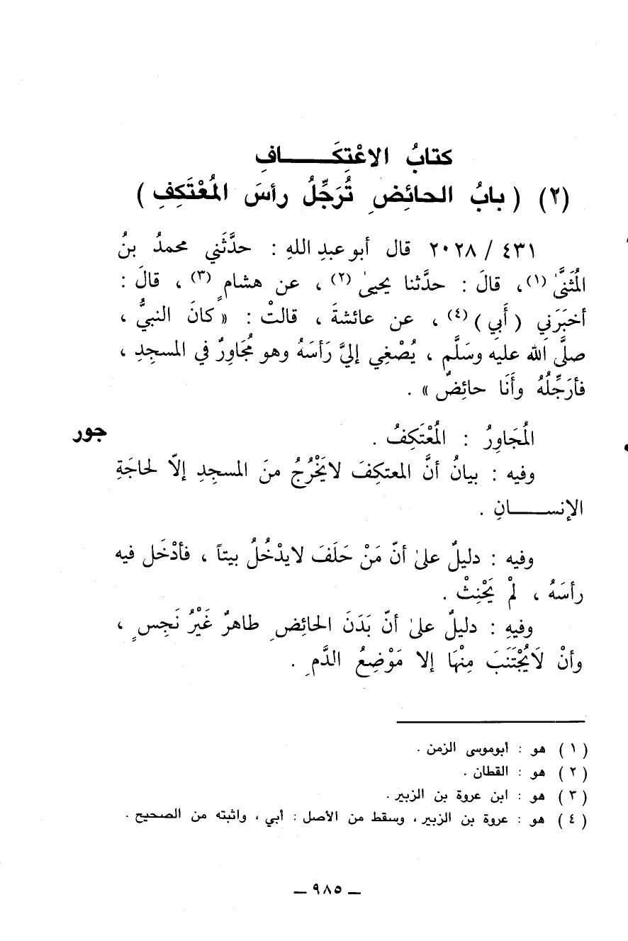 431/ 2028 - قال أبو عبد الله: حدثني محمد بن المثنى، قال: حدثنا يحيى، عن هشام، قال: أخبرني (أبي)، عن عائشة قالت: كان النبي صلى الله عليه وسلم يصغي إلي رأسه وهو مجاور في المسجد فأرجله وأنا حائض).
