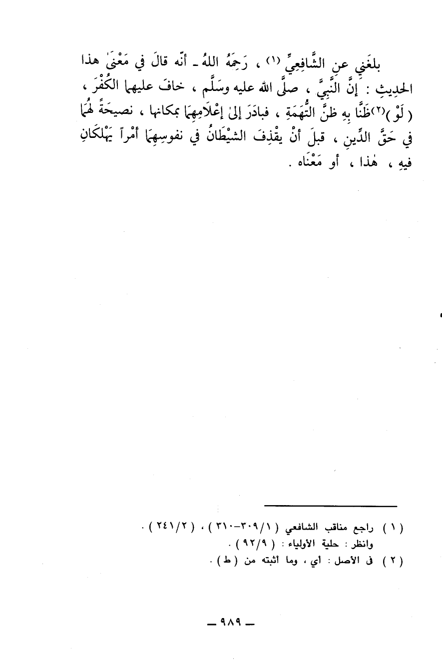 بلغني عن الشافعي رحمه الله أنه قال في معنى هذا الحديث: إن النبي صلى الله عليه وسلم خاف عليهما الكفر، (لو) ظنا به ظن التهمة، فبادر إلى إعلامهما بمكانها، نصيحة لهما في حق الدين، قبل أن يقذف الشيطان في نفوسهما أمرا يهلكان فيه، هذا أو معناه.