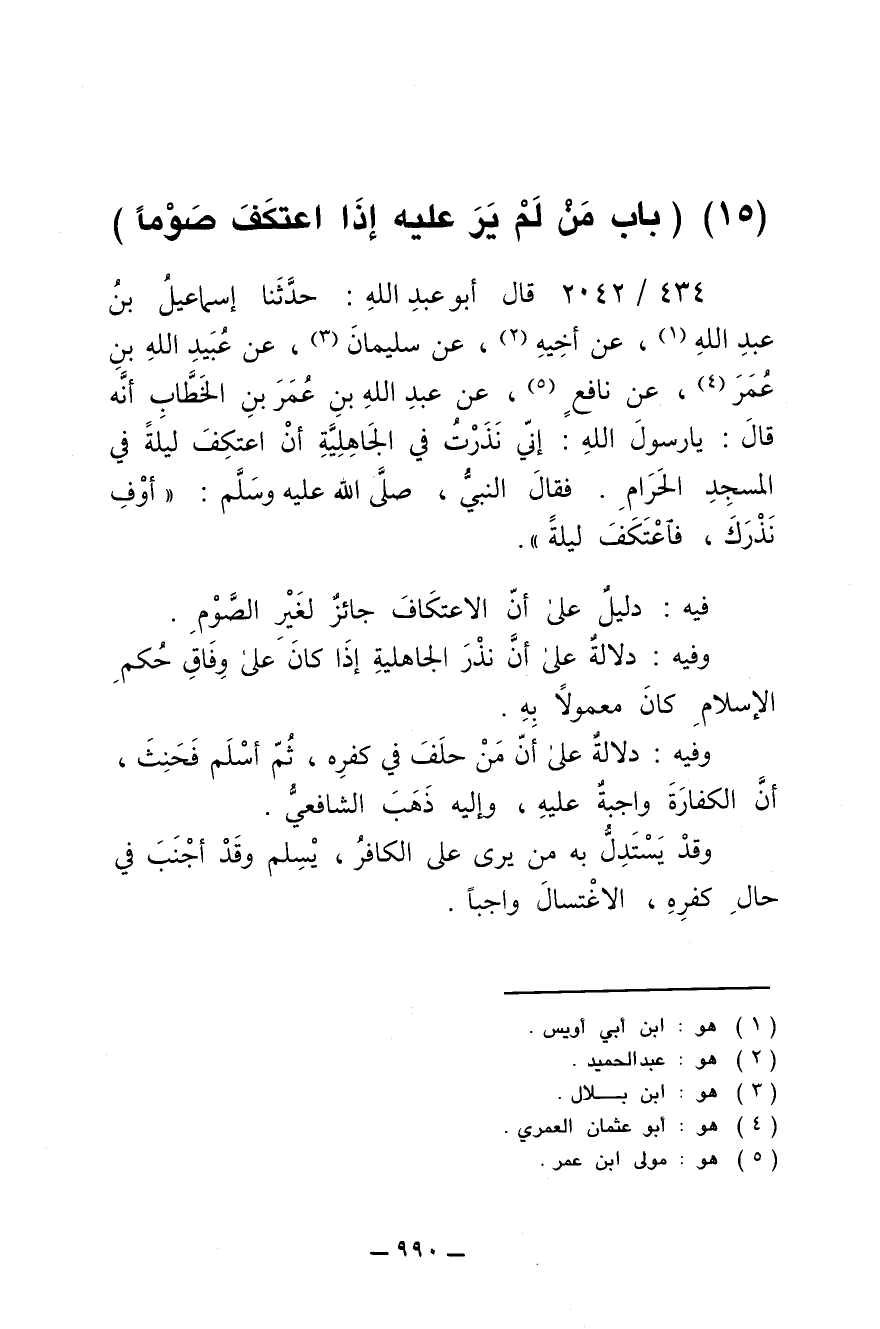 434/ 2042 - قال أبو عبد الله: حدثنا إسماعيل بن عبد الله، عن أخيه، عن سليمان، عن عبيد الله بن عمر، عن نافع، عن عبد الله بن عمر بن الخطاب أنه قال يا رسول الله، إني نذرت في الجاهلية أن أعتكف ليلة في المسجد الحرام، فقال النبي صلى الله عليه وسلم: (أوف بنذرك)، فاعتكف ليلة.
