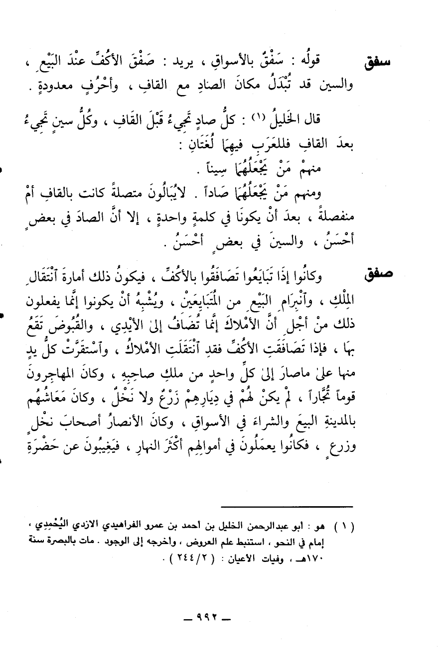 وكانوا إذا تبايعوا تصافقوا بالأكف، فيكون ذلك أمارة انتقال الملك وانبرام البيع من المتبايعين، ويشبه أن يكونوا إنما يفعلون ذلك من أجل أن الأملاك إنما تضاف إلى الأيدي، والقبوض تقع بها، فإذا تصافقت الأكف فقد انتقلت الأملاك، واستقرت كل يد منها على ما صار إلى كل واحد من ملك صاحبه، وكان المهاجرون قوما تجارا، لم يكن لهم في ديارهم زرع ولا نخل، وكان معاشهم بالمدينة البيع والشراء في الأسواق، وكان الأنصار أصحاب نخل وزرع، فكانوا يعملون في أموالهم أكثر النهار، فيغيبون عن حضرة