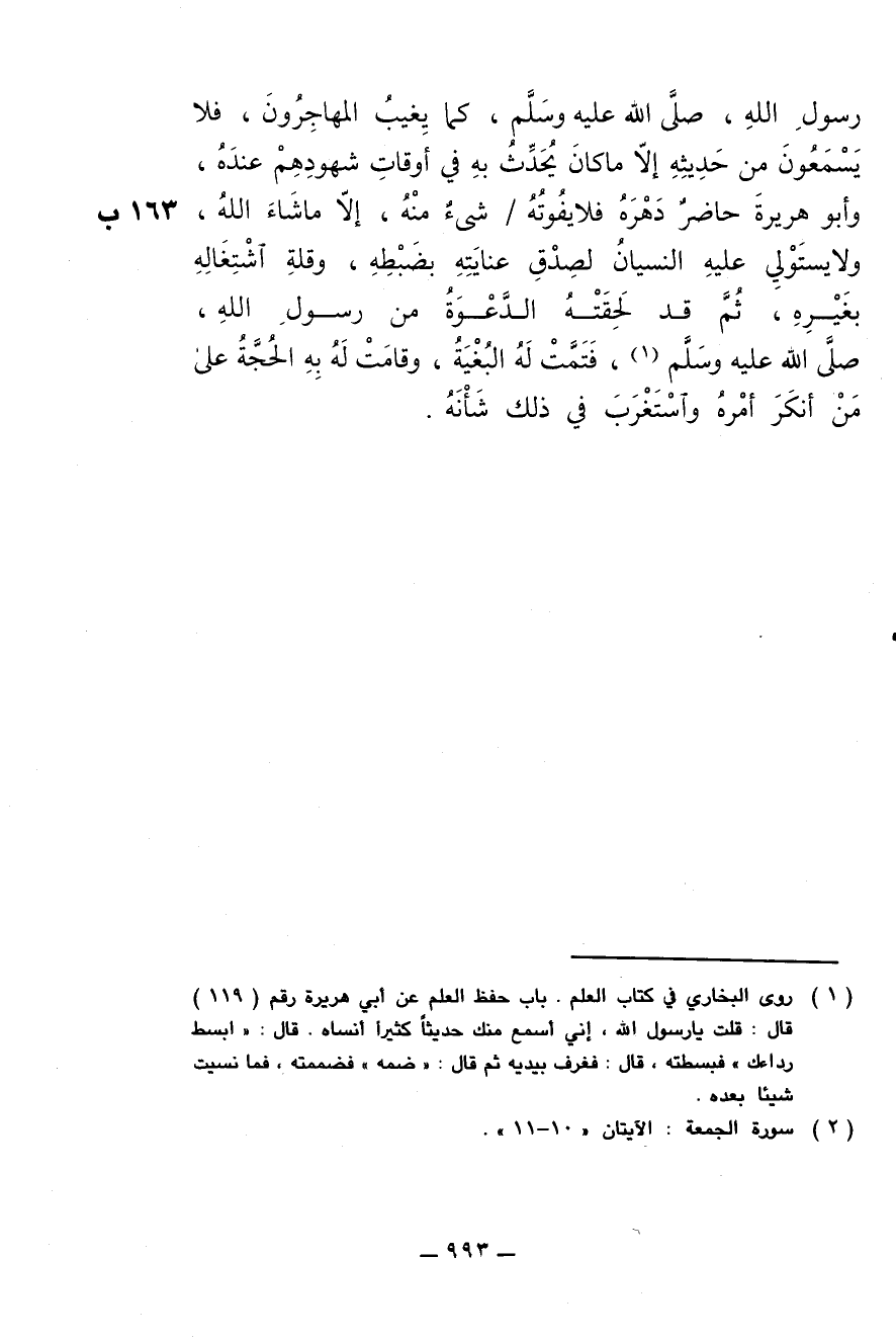 رسول الله صلى الله عليه وسلم، كما يغيب المهاجرون، فلا يسمعون من حديثه إلا ما كان يحدث به في أوقات شهودهم عنده، وأبو هريرة حاضر دهره فلا يفوته شيء منه، إلا ما شاء الله، ولا يستولي عليه النسيان لصدق عنايته بضبطه وقلة اشتغاله بغيره، ثم قد لحقته الدعوة من رسول الله صلى الله عليه وسلم فتمت له البغية، وقامت له به الحجة على من أنكر أمره واستغرب في ذلك شأنه.