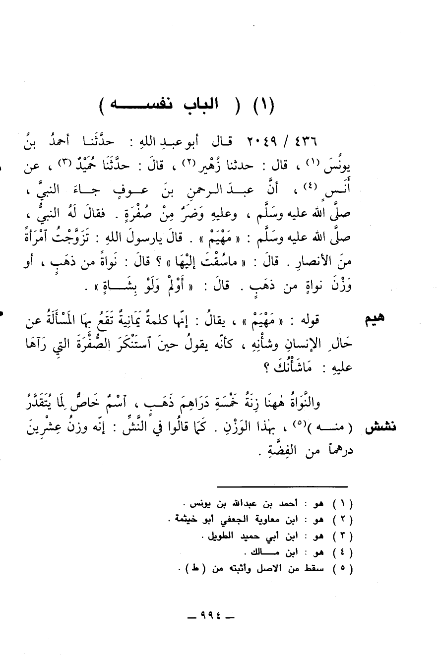 436/ 2049 - قال أبو عبد الله: حدثنا أحمد بن يونس، قال: حدثنا زهير، قال: حدثنا حميد، عن أنس، أن عبد الرحمن بن عوف جاء النبي صلى الله عليه وسلم وعليه وضر من صفرة، فقال له النبي صلى الله عليه وسلم: (مهيم). قال: يا رسول الله، تزوجت امرأة من الأنصار، قال: ما سقت إليها؟ قال: نواة من ذهب أو وزن نواة من ذهب، قال: أولم ولو بشاة.