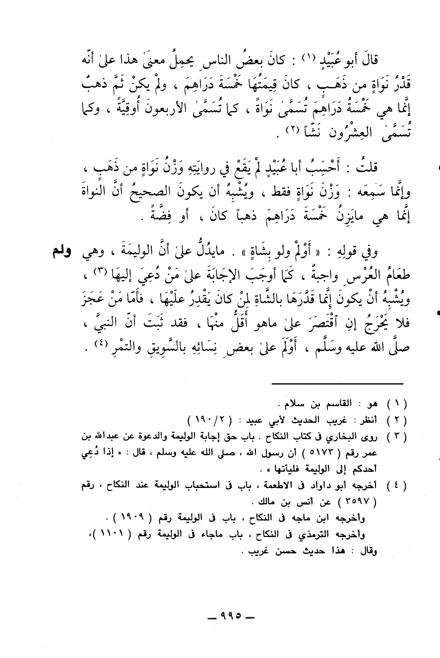 قلت: أحسب أبا عبيد لم يقع في روايته وزن نواة من ذهب، وإنما سمعه: وزن نواة فقط، ويشبه أن يكون الصحيح أن النواة إنما هي ما يزن خمسة دراهم ذهبا كان أو فضة.