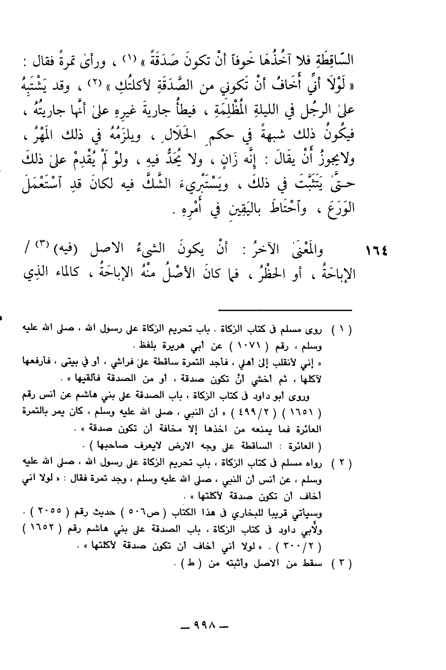 الساقطة فلا آخذها خوفا أن تكون صدقة)، ورأى تمرة فقال: (لولا أني أخاف أن تكوني من الصدقة لأكلتك)، وقد يشتبه على الرجل في الليلة المظلمة فيطأ جارية غيره على أنها جاريته، فيكون ذلك شبهة في حكم الحلال، ويلزمه في ذلك المهر، ولا يجوز أن يقال: إنه زان، ولا يحد فيه، ولو لم يقدم على ذلك حتى يتثبت في ذلك ويستبرئ الشك فيه لكان قد استعمل الورع واحتاط باليقين في أمره.