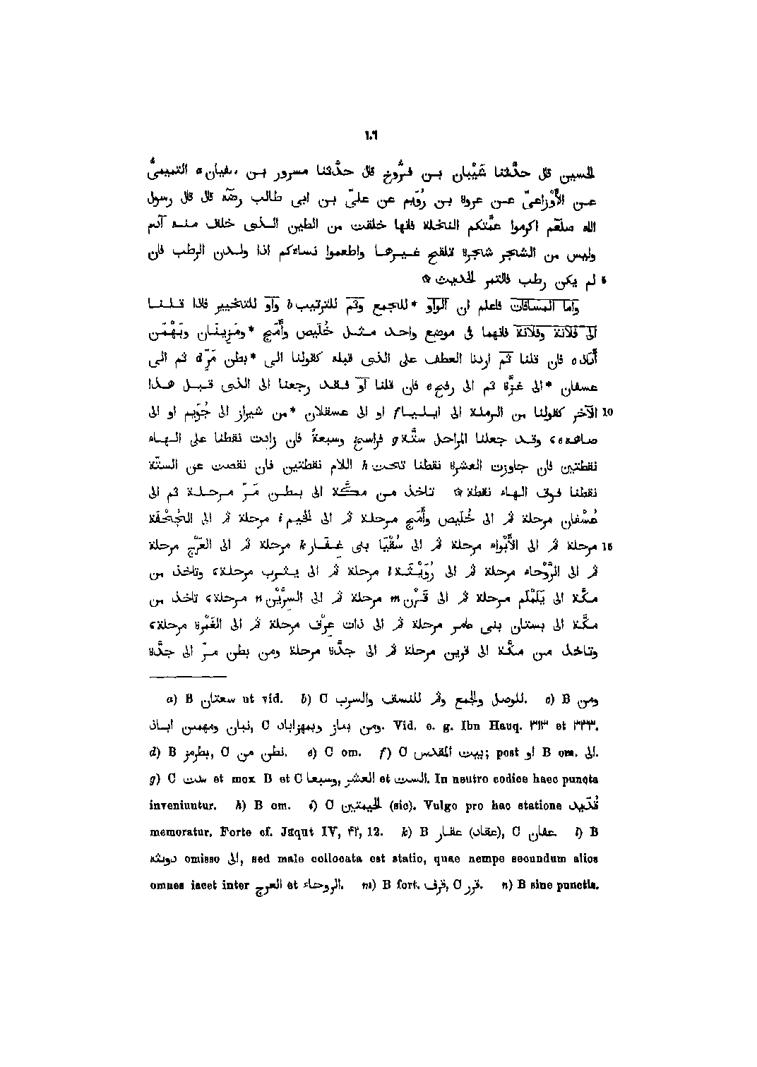 الحسين قال حدّثنا شيبان بن فرّوخ قال حدّثنا مسرور بن سفيان [1] التميميّ عن الأوزاعيّ عن عروة بن رويم عن عليّ بن ابى طالب رضي الله عنه قال قال رسول الله صلى الله عليه وسلم أكرموا عمّتكم النخلة فإنها خلقت من الطين الّذي خلق منه آدم وليس من الشجر شجرة تلقح غيرها وأطعموا نساءكم إذا ولدن الرطب فان 5 لم يكن رطب فالتمر الحديث واما المسافات فاعلم ان الواو للجمع وثم للترتيب [2] وأو للتخيير فإذا قلنا الى فلانة وفلانة فإنهما في موضع واحد مثل خليص وأمج ومزينان وبهمن أداذ [3] فان قلنا ثم أردنا العطف على الّذي قبله كقولنا الى بطن مرّ [4] ثم الى عسفان الى غزّة ثم الى رفح [5] فان قلنا أو فقد رجعنا الى الّذي قبل هذا 10 الآخر كقولنا من الرملة الى إيليا [6] أو الى عسقلان من شيراز الى جويم أو الى صاهه [5] ، وقد جعلنا المراحل ستّة [7] فراسخ وسبعة فان زادت نقطنا على الهاء نقطتين فان جاوزت العشرة نقطنا تحت [8] اللام نقطتين فان نقصت عن الستّة نقطنا فوق الهاء نقطة تأخذ من مكّة الى بطن مرّ مرحلة ثم الى عسفان مرحلة ثم الى خليص وأمج مرحلة ثم الى الخيم [9] مرحلة ثم الى الجحفة 15 مرحلة ثم الى الأبواء مرحلة ثم الى سقيا بنى غفار [10] مرحلة ثم الى العرج مرحلة ثم الى الرّوحاء مرحلة ثم الى رويثة [11] مرحلة ثم الى يثرب مرحلة، وتأخذ من مكّة الى يلملم مرحلة ثم الى قرن [12] مرحلة ثم الى السّرين [13] مرحلة، تأخذ من مكّة الى بستان بنى عامر مرحلة ثم الى ذات عرق مرحلة ثم الى الغمرة مرحلة، وتأخذ من مكّة الى قرين مرحلة ثم الى جدّة مرحلة ومن بطن مرّ الى جدّة