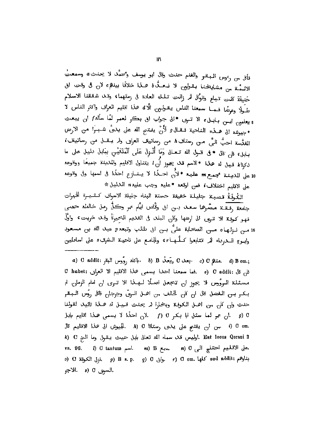 فأكل من رءوس البقر والغنم حنث وقال ابو يوسف ومحمّد لا يحنث [1] وسمعت الائمّة من مشايخنا يقولون لا نعدّ [2] هذا خلافا بينهم [3] لان في وقت ابى حنيفة كانت تباع وتؤكل ثم زالت تلك العادة في زمانهما، وقد شققنا الإسلام طولا وعرضا فما سمعنا الناس يقولون الّا [4] هذا إقليم العراق وأكثر الناس لا يعلمون اين بابل [5] الا ترى الى جواب ابى بكر لعمر لمّا سأله [6] ان يبعث جيوشه الى هذه الناحية فقال [7] لأن يفتح الله على يدىّ شبرا من الأرض المقدّسة أحبّ الىّ من رستاق [8] من رساتيق العراق ولم يقل من رساتيق [9] بابل، فان قال في قول الله تعالى وما أنزل على الملكين ببابل دليل على ما ذكرنا [10] قيل له هذا الاسم قد يجوز ان [11] يتناول الإقليم والمدينة جميعا ووقوعه على المدينة مجمع [12] عليه لأن أحدا لا ينازع أحدا في اسمها وفي وقوعه على الإقليم اختلاف [9] فمن أوقعه عليه وجب عليه [13] الدليل الكوفة قصبة جليلة خفيفة حسنة البناء جليلة الأسواق كثيرة الخيرات جامعة رفقة مصرّها سعد بن ابى وقّاص أيّام عمر وكلّ رمل خالطه حصى فهو كوفة الا ترى الى أرضها وكان البلد في القديم الحيرة وقد خربت، وأوّل من نزلها [14] من الصحابة عليّ بن ابى طالب وتبعه [15] عبد الله بن مسعود وابو [16] الدرداء ثم تتابعوا كلّها [17] ، والجامع على ناحية الشرق [18] على أساطين