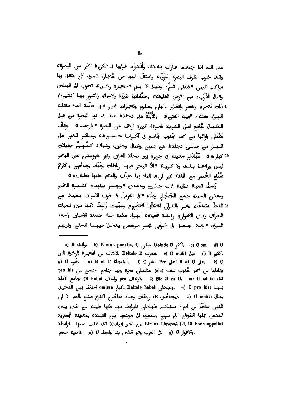 على انه إذا جمعت عمارات بغداد وأندر [1] خرابها لم تكن [2] أكبر من البصرة، وقد خرب طرف البصرة البرّيّ، واشتقّ اسمها من الحجارة السود كان يثقل بها مراكب اليمن فتلقى ثمّ [3] وقيل لا بل حجارة رخوة [4] تضرب الى البياض وقال قطرب [5] من الأرض الغليظة، وحمّاماتها طيّبة والأسماك والتمور بها كثيرة [6] ذات لحم [7] وخضر واقطان والبان وعلوم وتجارات غير انها ضيّقة الماء منقلبة الهواء عفنة [3] عجيبة الفتن والأبلّة على دجلة [8] عند فم نهر البصرة من قبل الشمال الجامع أعلى القرية عامرة [9] كبيرة ارفق من البصرة وارحب وشقّ عثمان بإزائها من نحو الجنوب الجامع في آخرها حسن [10] ، وسائر المدن على انهار من جانبي دجلة [10] عن يمين وشمال وجنوب وشمال [11] كلّهنّ جليلات كبار [12] عبّادان مدينة في جزيرة بين دجلة العراق ونهر خوزستان على البحر ليس وراءها بلد ولا قرية الّا البحر فيها رباطات وعبّاد وصالحون وأكثرهم صنّاع الحصر من الحلفاء غير ان [13] الماء بها ضيّق والبحر عليها مطبق [14] واسط قصبة عظيمة ذات جانبين وجامعين وجسر بينهما [3] كثيرة الخير ومعدن السمك جامع الحجاج وقبّته في الغربىّ في طرف الأسواق بعيد عن الشطّ متشعّث عامر بالقرآن اختطّها الحجّاج [15] وسمّيت واسط لأنها بين قصبات العراق وبين الأهواز [16] رفقة صحيحة الهواء عذبة الماء حسنة الأسواق واسعة السواد، وقد جعل في طرفي الجسر موضعان يدخل فيهما السفن وفيهم