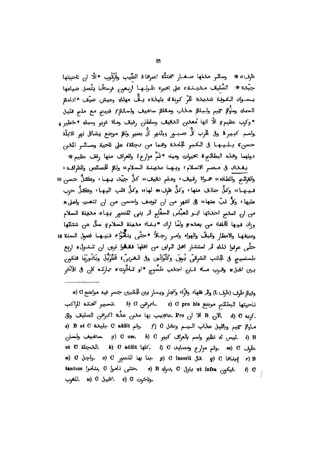 ظرف [1] وسائر مدنها صغار مختلّة اعمرها [2] الطّيب وقرقوب الّا ان ناحيتها جيّدة الصّليق مدينة [3] على بحيرة طولها أربعون فرسخا يتّصل ضياعها بسواد الكوفة شديدة الحرّ كربة [4] بليذة [5] بقّ مهلك وعيش ضيّق ادامهم السمك وماؤهم حميم وليلهم عذاب وعقلهم سخيف ولسانهم [6] قبيح مع ملح قليل وكرب عظيم [7] الّا انها معدن الدقيق وسلطان رفيق وماء غزير وسمك خطير واسم كبير [8] وفي الحرب كلّ صبور وبالنهر كلّ بصير ولهم موضع يشاكل نهر الأبلّة حسن، يليها في الكبر الجامدة وهما من دجلة [9] على ناحية وسائر المدن دونهما وهذه البطائح [10] بحيرات ومياه ثمّ مزارع [11] وللعراق منها رفق عظيم بغداد في مصر الإسلام، وبها مدينة السلام، ولهم الخصائص والظرافة، والقرائح واللطافة، هواء رقيق، وعلم دقيق، كلّ جيّد بها، وكلّ حسن فيها، وكلّ حاذق منها، وكلّ ظرف [12] لها، وكلّ قلب اليها، وكلّ حرب عليها، وكلّ ذبّ عنها، هي أشهر من ان توصف وأحسن من ان تنعت وأعلى [13] من ان تمدح أحدثها ابو العبّاس السفّاح ثم بنى المنصور بها [14] مدينة السلام وزاد فيها الخلفاء من بعده [15] ولمّا أراد بناء مدينة السلام [16] سأل عن شتائها وصيفها والامطار والبقّ والهواء وامر رجالا حتّى يناموا [17] فيها فصول السنة حتّى عرفوا ذلك ثم استشار أهل الرأي من أهلها فقالوا نرى ان تنزل [18] اربع طساسيج في الجانب الشرقىّ بوق وكلواذى وفي الغربىّ [19] قطربُّل وبادوريا فتكون بين نخل [20] وقرب ماء فان اجدب طسّوج أو تاخرت [21] عمارته كان في الآخر