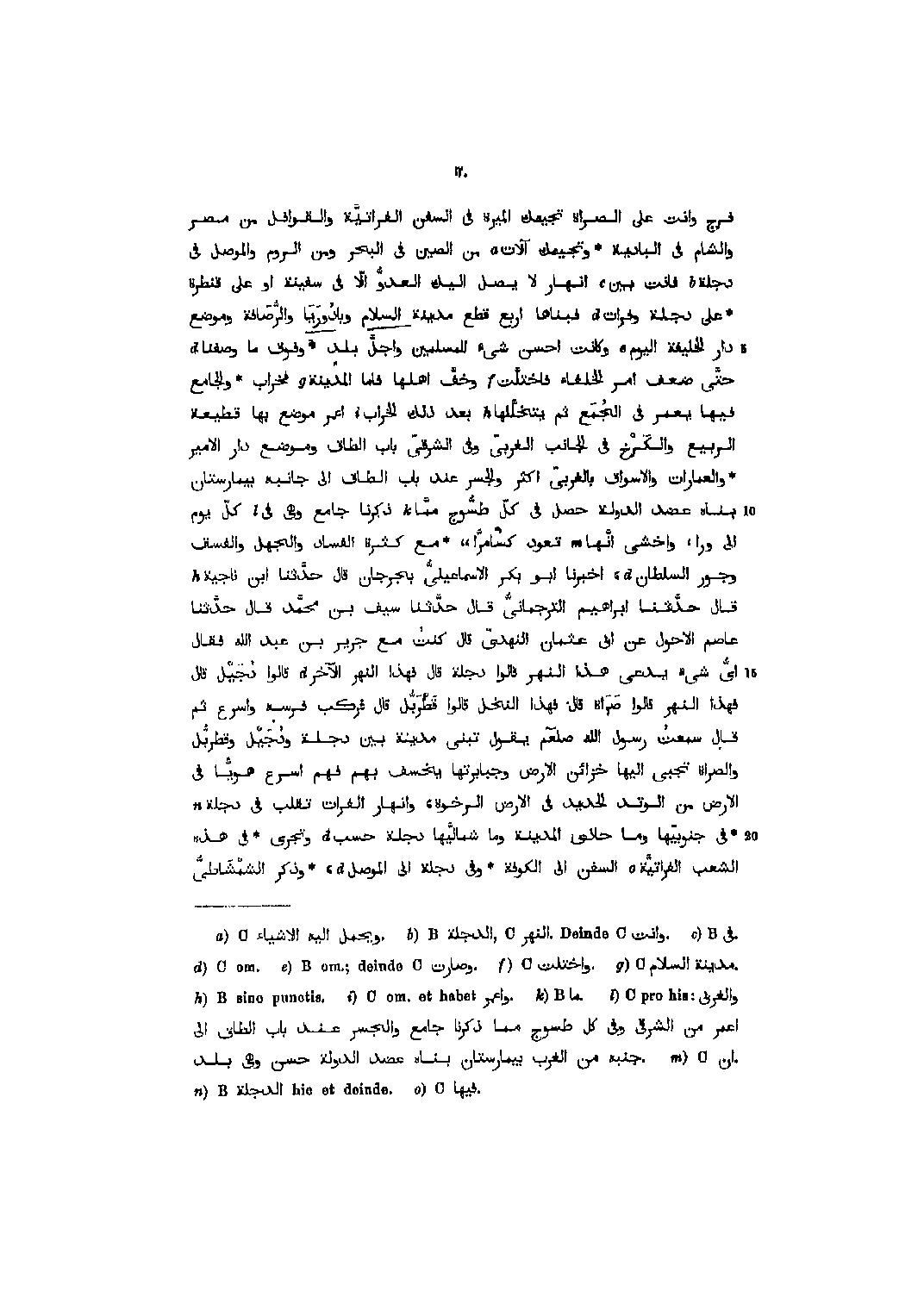 فرج وأنت على الصراة تجيئك الميرة في السفن الفراتيّة والقوافل من مصر والشام في البادية وتجيئك آلات [1] من الصين في البحر ومن الروم والموصل في دجلة [2] فأنت بين [3] أنهار لا يصل إليك العدوّ الّا في سفينة أو على قنطرة على دجلة وفرات [4] فبناها اربع قطع مدينة السلام وبادوريا والرّصافة وموضع دار الخليفة اليوم [5] وكانت أحسن شيء للمسلمين واجلّ بلد وفوق ما وصفنا [4] حتّى ضعف امر الخلفاء فاختلّت [6] وخفّ أهلها فاما المدينة [7] فخراب والجامع فيها يعمر في الجمع ثم يتخلّلها [8] بعد ذلك الخراب [9] اعمر موضع بها قطيعة الربيع والكرخ في الجانب الغربىّ وفي الشرقي باب الطاق وموضع دار الأمير والعمارات والأسواق بالغربيّ أكثر والجسر عند باب الطاق الى جانبه بيمارستان بناه عضد الدولة حصل في كلّ طسّوج ممّا [10] ذكرنا جامع وهي في [11] كلّ يوم الى ورا، وأخشى انّها [12] تعود كسامرّا،، مع كثرة الفساد والجهل والفسق وجور السلطان [4] ، أخبرنا أبو بكر الإسماعيليّ بجرجان قال حدّثنا ابن ناجية [8] قال حدّثنا إبراهيم الترجمانيّ قال حدّثنا سيف بن محمّد قال حدّثنا عاصم الأحول عن ابى عثمان النهدىّ قال كنت مع جرير بن عبد الله فقال اىّ شيء يدعى هذا النهر قالوا دجلة قال فهذا النهر الآخر [4] قالوا دجيل قال فهذا النهر قالوا صراة قال فهذا النخل قالوا قطربُّل قال فركب فرسه وأسرع ثم قال سمعت رسول الله صلى الله عليه وسلم يقول تبنى مدينة بين دجلة ودجيل وقطربُّل والصراة تجبى اليها خزائن الأرض وجبابرتها يخسف بهم فهم أسرع هويّا في الأرض من الوتد الحديد في الأرض الرخوة، وانهار الفرات تقلب في دجلة [13] في جنوبيّها وما حاذى المدينة وما شماليّها دجلة حسب [4] وتجرى في هذه الشعب الفراتيّة [14] السفن الى الكوفة وفي دجلة الى الموصل [4] ، وذكر الشمشاطىّ
