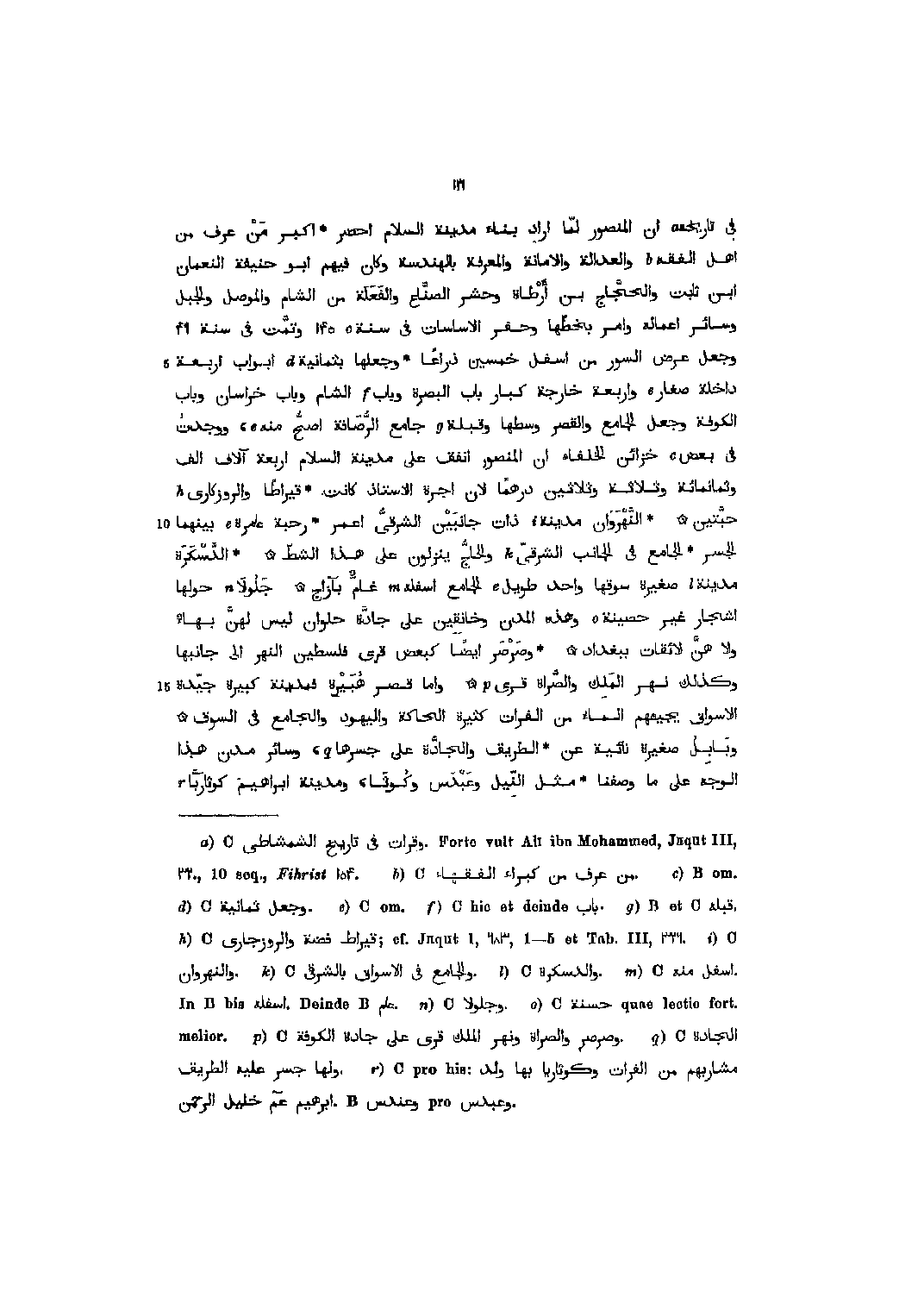 في تاريخه [1] ان المنصور لمّا أراد بناء مدينة السلام احضر أكبر من عرف من أهل الفقه [2] والعدالة والأمانة والمعرفة بالهندسة وكان فيهم ابو حنيفة النعمان ابن ثابت والحجّاج بن أرطاة وحشر الصنّاع والفعلة من الشام والموصل والجبل وسائر اعماله وامر بخطّها وحفر الأساسات في سنة [3] 145 وتمّت في سنة 49 وجعل عرض السور من أسفل خمسين ذراعا وجعلها بثمانية [4] أبواب اربعة داخلة صغار [5] واربعة خارجة كبار باب البصرة وباب [6] الشام وباب خراسان وباب الكوفة وجعل الجامع والقصر وسطها وقبلة [7] جامع الرّصافة اصحّ. منه [5] ، ووجدت في بعض [3] خزائن الخلفاء ان المنصور أنفق على مدينة السلام اربعة آلاف ألف وثمانمائة وثلاثة وثلاثين درهما لان اجرة الأستاذ كانت قيراطا والروزكارى [8] حبّتين النّهروان مدينة [9] ذات جانبين الشرقىّ اعمر رحبة عامرة [5] بينهما الجسر الجامع في الجانب الشرقىّ [10] والحاجّ ينزلون على هذا الشطّ الدّسكرة مدينة [11] صغيرة سوقها واحد طويل [5] الجامع أسفله [12] غامّ بآزاج جلولا [13] حولها أشجار غير حصينة [14] وهذه المدن وخانقين على جادّة حلوان ليس لهنّ بهاء ولا هنّ لائقات ببغداد وصرصر أيضا كبعض قرى فلسطين النهر الى جانبها وكذلك نهر الملك والصّراة قرى [15] واما قصر هبيرة فمدينة كبيرة جيّدة الأسواق يجيئهم الماء من الفرات كثيرة الحاكة واليهود والجامع في السوق وبابل صغيرة نائية عن الطريق والجادّة على جسرها [16] ، وسائر مدن هذا الوجه على ما وصفنا مثل النّيل وعبدس وكوثا، ومدينة إبراهيم كوثاريّا [17]