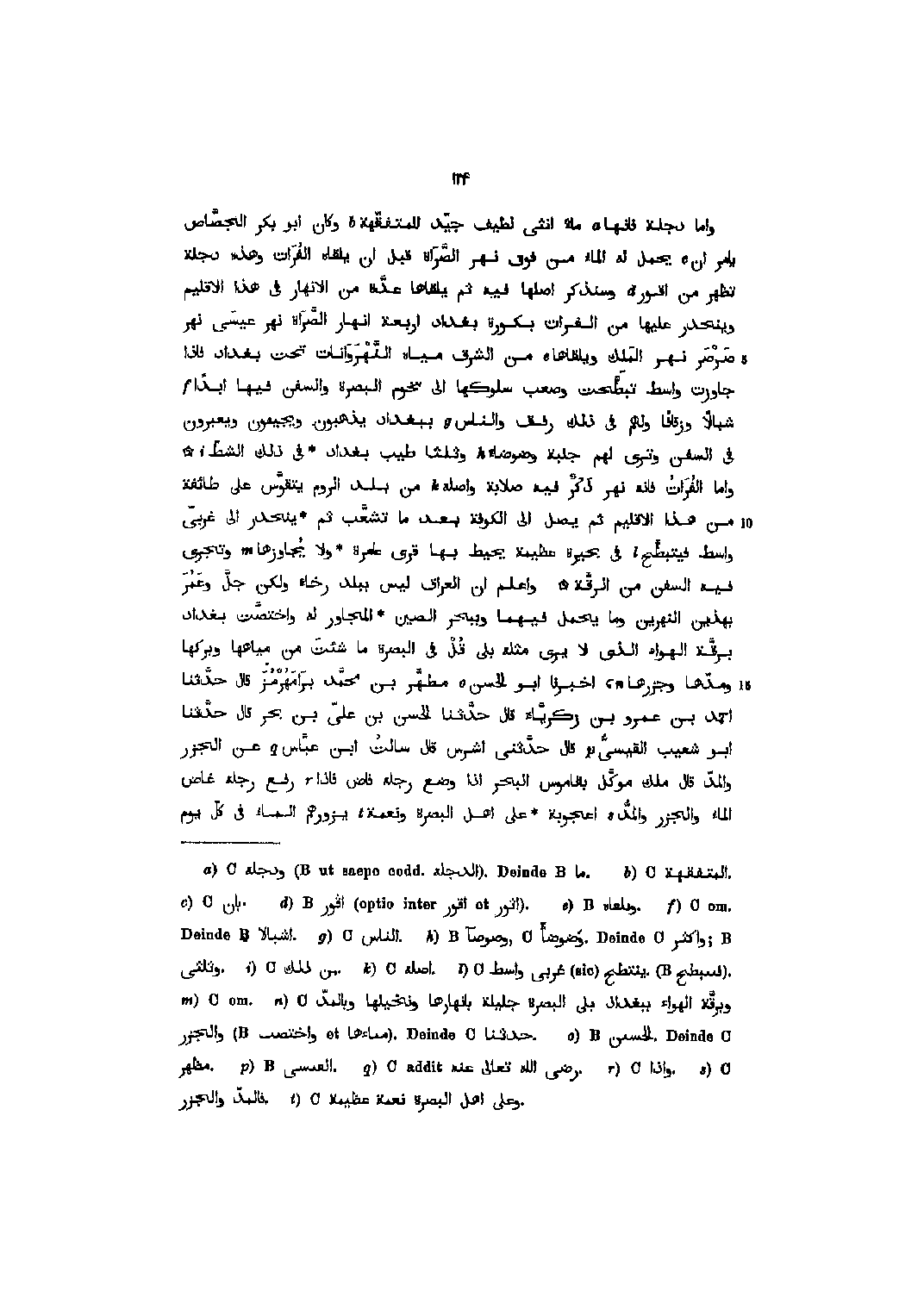 واما دجلة فإنها [1] ماء أنثى لطيف جيّد للمتفقّهة [2] وكان ابو بكر الجصّاص يأمر ان [3] يحمل له الماء من فوق نهر الصّراة قبل ان يلقاه الفرات وهذه دجلة تظهر من اقور [4] وسنذكر أصلها فيه ثم يلقاها عدّة من الأنهار في هذا الإقليم وينحدر عليها من الفرات بكورة بغداد اربعة انهار الصّراة نهر عيسى نهر صرصر نهر الملك ويلقاها [5] من الشرق مياه النّهروانات تحت بغداد فإذا جاوزت واسط تبطّحت وصعب سلوكها الى و [؟] م البصرة والسفن فيها ابدا [6] شبالا وزقافا ولهم في ذلك رفق والناس [7] ببغداد يذهبون ويجيئون ويعبرون في السفن وترى لهم جلبة وضوضاء [8] وثلثا طيب بغداد في ذلك الشطّ [9] واما الفرات فإنه نهر ذكر فيه صلابة وأصله [10] من بلد الروم يتقوّس على طائفة من هذا الإقليم ثم يصل الى الكوفة بعد ما تشعّب ثم ينحدر الى غربىّ واسط فيتبطّح [11] في بحيرة عظيمة يحيط بها قرى عامرة ولا يجاوزها [12] وتجرى فيه السفن من الرقّة واعلم ان العراق ليس ببلد رخاء ولكن جلّ وعمر بهذين النهرين وما يحمل فيهما وببحر الصين المجاور له واختصّت بغداد برقّة الهواء الّذي لا يرى مثله بلى قل في البصرة ما شئت من مياهها وبركها ومدّها وجزرها [13] ، أخبرنا ابو الحسن [14] مطهّر بن محمّد برامهرمز قال حدّثنا احمد بن عمرو بن زكريّا قال حدّثنا الحسن بن عليّ بن بحر قال حدّثنا ابو شعيب القيسيّ [15] قال حدّثنى اشرس قال سالت ابن عبّاس [16] عن الجزر والمدّ قال ملك موكّل بقاموس البحر إذا وضع رجله فاض فإذا [17] رفع رجله غاض الماء والجزر والمدّ [18] اعجوبة على أهل البصرة ونعمة [19] يزورهم الماء في كلّ يوم