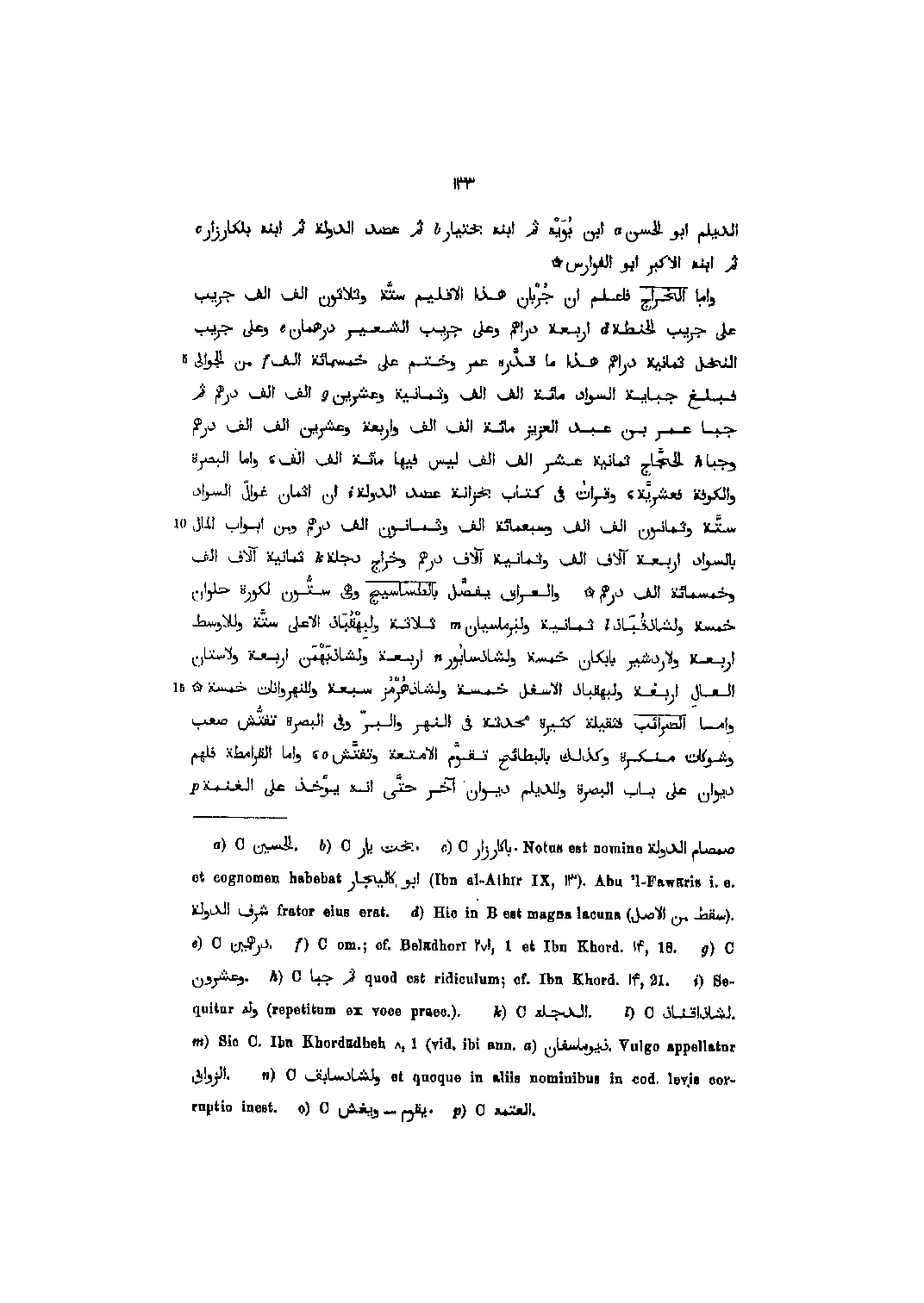 الديلم ابو الحسن [1] ابن بويه ثم ابنه بختيار [2] ثم عضد الدولة ثم ابنه بلكارزار [3] ثم ابنه الأكبر ابو الفوارس وأما الخراج فاعلم ان جربان هذا الإقليم ستّة وثلاثون ألف ألف جريب على جريب الحنطة [4] اربعة دراهم وعلى جريب الشعير درهمان [5] وعلى جريب النخل ثمانية دراهم هذا ما قدّره عمر وختم على خمسمائة ألف [6] من الجوالى فبلغ جباية السواد مائة ألف ألف وثمانية وعشرين [7] ألف ألف درهم ثم جبا عمر بن عبد العزيز مائة ألف ألف واربعة وعشرين ألف ألف درهم وجبى [8] الحجّاج ثمانية عشر ألف ألف ليس فيها مائة ألف ألف، واما البصرة والكوفة فعشريّة، وقرأت في كتاب بخزانة عضد الدولة [9] ان أثمان غوالّ السواد ستّة وثمانون ألف ألف وسبعمائة ألف وثمانون ألف درهم ومن أبواب المال بالسواد اربعة آلاف ألف وثمانية آلاف درهم وخراج دجلة [10] ثمانية آلاف ألف وخمسمائة ألف درهم والعراق يفصّل بالطساسيج وهي ستّون لكورة حلوان خمسة ولشاذقباذ [11] ثمانية ولبرماسيان [12] ثلاثة ولبهقباذ الأعلى ستّة وللأوسط اربعة ولاردشير بابكان خمسة ولشاذسابور [13] اربعة ولشاذبهمن اربعة ولاستان العال اربعة ولبهقباذ الأسفل خمسة ولشاذهرمز سبعة وللنهروانات خمسة واما الضرائب فثقيلة كثيرة محدثة في النهر والبرّ وفي البصرة تفتّش صعب وشوكات منكرة وكذلك بالبطائح تقوّم الأمتعة وتفتّش [14] ، واما القرامطة فلهم ديوان على باب البصرة والديلم ديوان آخر حتّى انه يؤخذ على الغنمة [15]
