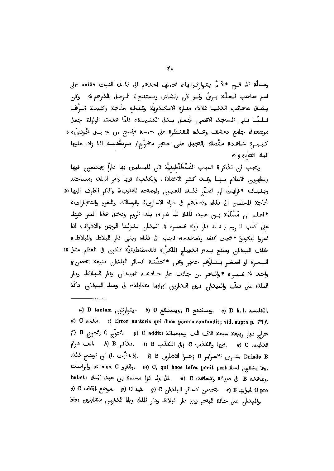 ومسلّة الى قوم ثمّ يتوارثونها [1] فحملها أحدهم الى ذلك النبت فقلعه على اسم صاحب العلّة بريء ولو كان بالشاش ويستنفع [2] الرجل بالدرهم وكان يقال عجائب الدنيا ثلاث منارة الاسكندريّة وقنطرة سنجة وكنيسة الرّها فلمّا بنى المسجد الأقصى جعل بدل الكنيسة [3] فلمّا هدمته الزلزلة جعل موضعه [4] جامع دمشق وهذه القنطرة على خمسة فراسخ من جبل الجودىّ [5] كبيرة شاهقة متّصلة بالجبل على حجر مخوّج [6] مركّبة إذا زاد عليها الماء اهتزّت [7] ويجب ان نذكر [8] أسباب القسطنطينيّة لان للمسلمين بها دارا يجتمعون فيها ويظهرون الإسلام بها وقد كثر الاختلاف والكذب [9] فيها وامر البلد ومساحته وبنيانه فرأيت ان اصوّر ذلك للعيون وأوضحه للقلوب [10] واذكر الطرق اليها لحاجة المسلمين الى ذلك وقصدهم في شراء الأسارى [11] والرسالات والغزو والتجارات، اعلم ان مسلمة بن عبد الملك لمّا غزا [12] بلد الروم ودخل هذا المصر شرط على كلب الروم بناء دار بإزاء قصره في الميدان ينزلها الوجوه والاشراف إذا أسروا ليكونوا تحت كنفه وتعاهده [13] فأجابه الى ذلك وبنى دار البلاط والبلاط [14] خلف الميدان يصنع به [15] الديباج الملكىّ، فالقسطنطينيّة تكون في العظم مثل البصرة أو أصغر بناؤهم حجر وهي محصّنة كسائر البلدان منيعة بحصن [16] واحد لا غير، والبحر من جانب على حافته الميدان ودار البلاط ودار الملك على صفّ والميدان بين الدارين أبوابها متقابلة [17] في وسط الميدان دكّة