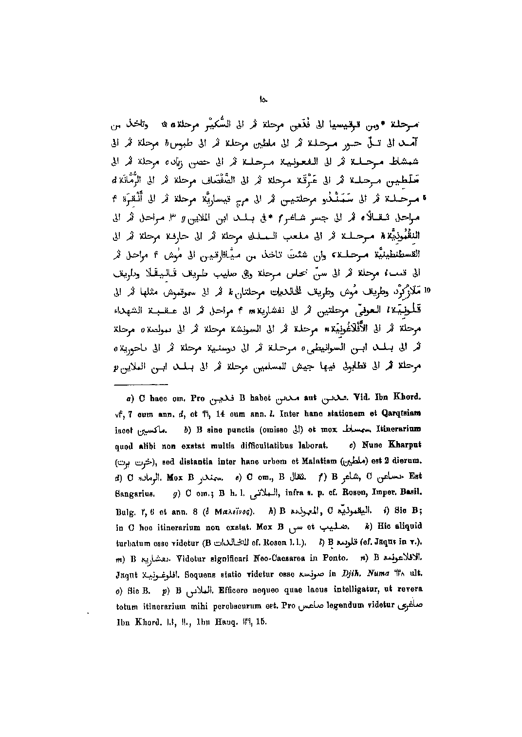 مرحلة ومن قرقيسيا الى فدين مرحلة ثم الى السّكير مرحلة [1] وتأخذ من آمد الى تلّ حور مرحلة ثم الى ملطين مرحلة ثم الى طبوس [2] مرحلة ثم الى شمشاط مرحلة ثم الى الفعونية مرحلة ثم الى حصن زياد [3] مرحلة ثم الى ملطين مرحلة ثم الى عرقة مرحلة ثم الى الصّفصاف مرحلة ثم الى الرّمّانة [4] مرحلة ثم الى سمندو مرحلتين ثم الى مرج قيساريّة مرحلة ثم الى أنقرة 4 مراحل ثقالا [5] ثم الى جسر شاغر [6] في بلد ابن الملاين [7] 3 مراحل ثم الى النقموذيّة [8] مرحلة ثم الى ملعب الملك مرحلة ثم الى حارفة مرحلة ثم الى القسطنطينيّة مرحلة، وان شئت تأخذ من ميّافارقين الى موش 4 مراحل ثم الى قنب [9] مرحلة ثم الى سنّ نحلس مرحلة وهي صليب طريق قاليقلا وطريق ملازكرد وطريق موش وطريق الخالديات مرحلتان [10] ثم الى سموقموش مثلها ثم الى قلونية [11] العوفيّ مرحلتين ثم الى نفشارية [12] 4 مراحل ثم الى عقبة الشهداء مرحلة ثم الى الأفلاغونية [13] مرحلة ثم الى السونشة مرحلة ثم الى بمولصة [14] مرحلة ثم الى بلد ابن السوانيطى [14] مرحلة ثم الى دوسنية مرحلة ثم الى [؟] باحورية [14] مرحلة ثم الى قطابولى فيها جيش للمسلمين مرحلة ثم الى بلد ابن الملاين [15]