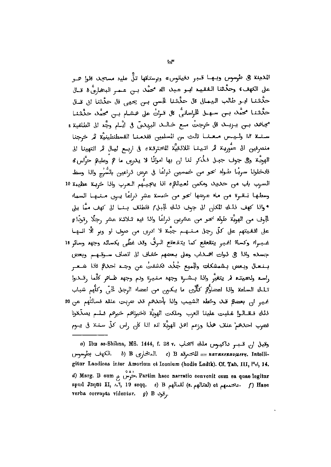 المدينة هي طرسوس وبها قبر دقيانوس [1] وبرستاقها تل عليه مسجد قالوا هو على الكهف، وحدّثنا الفقيه ابو عبد الله محمّد بن عمر البخاريّ [2] قال حدّثنا ابو طالب اليماني قال حدّثنا الحسن بن يحيى قال حدّثنا ابى قال حدّثنا محمّد بن سهل الخراسانىّ قال قرأت على هشام بن محمّد حدّثنا مجاهد بن يزيد قال خرجت مع خالد البريديّ في أيّام وجّه الى الطاغية سنة 102 وليس معنا ثالث من المسلمين فقدمنا القسطنطينيّة ثم خرجنا منصرفين الى عمّورية ثم أتينا اللاذقيّة المحترقة [3] في اربع ليال ثم انتهينا الى الهويّة وهي جوف جبل فذكر لنا ان بها أمواتا لا يدرى ما هم وعليهم حرّاس [4] فادخلونا سربا طوله نحو من خمسين ذراعا في عرض ذراعين بالسّرج وإذا وسط السرب باب من حديد ومكمن لعيالهم [5] إذا يجيهم العرب وإذا خربة عظيمة وسطها نقرة من ماء عرضها نحو من خمسة عشر ذراعا يرى منها السماء وإذا كهف ذلك المكان الى جوف ذلك الجبل [6] فانطلق بنا الى كهف ممّا يلي الجوف من الهويّة طوله نحو من عشرين ذراعا وإذا فيه ثلاثة عشر رجلا رقودا [7] على أقفيتهم على كلّ رجل منهم جبّة لا أدرى من صوف أو وبر الّا انها غبراء وكساء اغبر يتقعقع كما يتقعقع الرقّ وقد غطّى بكسائه وجهه وسائر جسده وإذا هي ذوات اهداب وعلى بعضهم خفاف الى انصاف سوقهم وبعض بنعال وبعض بشمشكات والجميع جدد فكشفت عن وجه أحدهم فإذا شعر رأسه ولحيته لم يتغيّر وإذا بشرة وجهه منيرة ودم وجهه ظاهر كانّما رقدوا تلك الساعة وإذا أعضاؤهم كألين ما يكون من أعضاء الرجل الحىّ وكلّهم شباب غير ان بعضهم قد وخطه الشيب وإذا بأحدهم قد ضربت عنقه فسألتهم عن ذلك فقالوا غلبت علينا العرب وملكت الهويّة فأخبرناهم خبرهم فلم يصدّقونا فضرب أحدهم عنق هذا وزعم أهل الهويّة انه إذا كان راس كلّ سنة في يوم