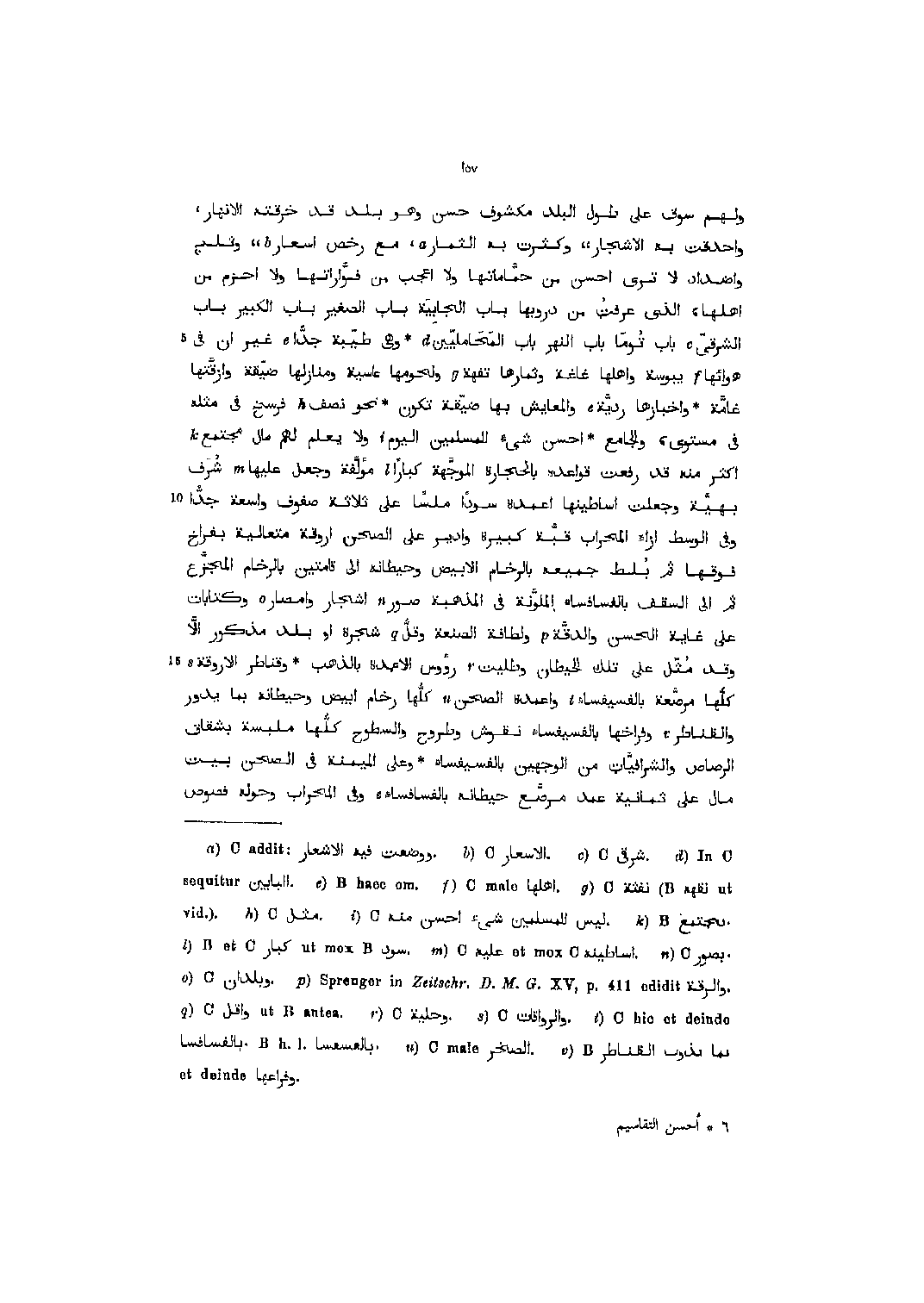 ولهم سوق على طول البلد مكشوف حسن وهو بلد قد خرقته الأنهار، وأحدقت به الأشجار،، وكثرت به الثمار [1] ، مع رخص اسعار [2] ،، وثلج وأضداد لا ترى أحسن من حمّاماتها ولا اعجب من فوّاراتها ولا احزم من أهلها، الّذي عرفت من دروبها باب الجابية باب الصغير باب الكبير باب الشرقىّ [3] باب توما باب النهر باب المحامليّين [4] وهي طيّبة جدّا [5] غير ان في هوائها [6] يبوسة وأهلها غاغة وثمارها تفهة [7] ولحومها عاسية ومنازلها ضيّقة وأزقّتها غامّة واخبارها رديّة [5] والمعايش بها ضيّقة تكون نحو نصف [8] فرسخ في مثله في مستوى، والجامع، أحسن شيء للمسلمين اليوم [9] ولا يعلم لهم مال مجتمع [10] أكثر منه قد رفعت قواعده بالحجارة الموجّهة كبارا [11] مؤلّفة وجعل عليها [12] شرف بهيّة وجعلت اساطينها اعمدة سودا ملسا على ثلاثة صفوف واسعة جدّا وفي الوسط إزاء المحراب قبّة كبيرة وادير على الصحن اروقة متعالية بفراخ فوقها ثم بلط جميعه بالرخام الأبيض وحيطانه الى قامتين بالرخام المجزّع ثم الى السقف بالفسافساء الملوّنة في المذهبة صور [13] أشجار وأمصار [14] وكتابات على غاية الحسن والدقّة [15] ولطافة الصنعة وقلّ [16] شجرة أو بلد مذكور ألّا وقد مثّل على تلك الحيطان وطليت [17] رءوس الاعمدة بالذهب وقناطر الاروقة [18] كلّها مرصّعة بالفسيفساء [19] واعمدة الصحن [20] كلّها رخام ابيض وحيطانه بما يدور والقناطر [21] وفراخها بالفسيفساء نقوش وطروح والسطوح كلّها ملبسة بشقاق الرصاص والشرافيّات من الوجهين بالفسيفساء وعلى الميمنة في الصحن بيت مال على ثمانية عمد مرصّع حيطانه بالفسافساء [5] وفي المحراب وحوله فصوص