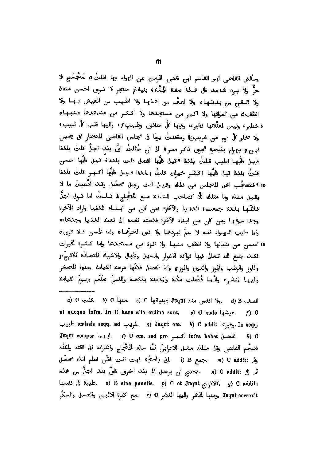 وسألني القاضي ابو القاسم ابن قاضى الحرمين عن الهواء بها فقلت [1] سجسج لا حرّ ولا برد شديد قال هذا صفة الجنّة، بنيانهم حجر لا ترى أحسن منه [2] ولا اتقن من بنائها [3] ولا اعفّ من أهلها ولا أطيب من العيش بها ولا أنظف [4] من أسواقها ولا أكبر من مسجدها ولا أكثر من مشاهدها عنبها [5] خطير، وليس لمعنّقتها نظير،، وفيها كلّ حاذق وطبيب [6] ، واليها قلب كلّ لبيب، ولا تخلو كلّ يوم من غريب،، وكنت يوما في مجلس القاضي المختار ابى يحيى ابن [7] بهرام بالبصرة فجرى ذكر مصر [8] الى ان سئلت اىّ بلد اجلّ قلت بلدنا قيل فأيّها أطيب قلت بلدنا قيل فأيّها أفضل قلت بلدنا [9] قيل فأيّها أحسن قلت بلدنا قيل فأيّها أكثر خيرات قلت بلدنا قيل فأيّها أكبر قلت بلدنا فتعجّب أهل المجلس من ذلك وقيل أنت رجل محصّل وقد ادّعيت ما لا يقبل منك وما مثلك الّا كصاحب الناقة مع الحجّاج [10] قلت اما قولي اجلّ فلأنّها بلدة جمعت [11] الدنيا والآخرة فمن كان من أبناء الدنيا وأراد الآخرة وجد سوقها ومن كان من أبناء الآخرة فدعته نفسه الى نعمة الدنيا وجدها [12] واما طيب الهواء فإنه لا سمّ لبردها ولا أذى لحرّها [13] واما الحسن فلا ترى [14] أحسن من بنيانها ولا أنظف منها ولا انزه من مسجدها واما كثرة الخيرات فقد جمع الله تعالى فيها فواكه الاغوار والسهل والجبال والأشياء المتضادّة كالأترج [15] واللوز والرطب والجوز والتين والموز [16] واما الفضل فلأنّها عرضة القيامة ومنها المحشر واليها المنشر [17] وانّما فضّلت مكّة والمدينة بالكعبة والنبيّ صلى الله عليه وسلم ويوم القيامة