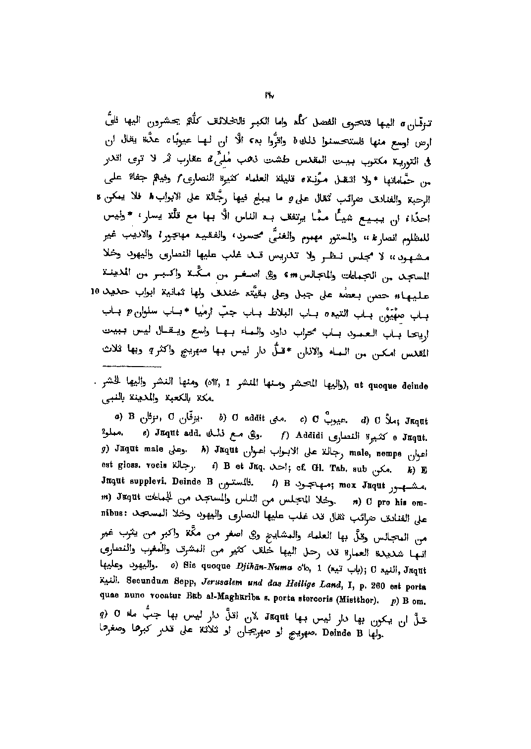تزفّان [1] اليها فتحوى الفضل كلّه واما الكبر فالخلائق كلّهم يحشرون اليها فأيّ ارض أوسع منها فاستحسنوا ذلك [2] واقرّوا به، الّا ان لها عيوبا [3] عدّة يقال ان في التوراة مكتوب بيت المقدس طشت ذهب مليء [4] عقارب ثم لا ترى اقدر من حمّاماتها ولا أثقل مؤنة [5] قليلة العلماء كثيرة النصارى [6] وفيهم جفا على الرحبة والفنادق ضرائب ثقال على [7] ما يباع فيها رجّالة على الأبواب [8] فلا يمكن أحدا [9] ان يبيع شيئا ممّا يرتفق به الناس الّا بها مع قلّة يسار، وليس للمظلوم أنصار [10] ،، والمستور مهموم والغنىّ محسود، والفقيه مهجور [11] والأديب غير مشهود،، لا مجلس نظر ولا تدريس قد غلب عليها النصارى واليهود وخلا المسجد من الجماعات والمجالس [12] ،، وهي أصغر من مكّة وأكبر من المدينة عليها [13] حصن بعضه على جبل وعلى بقيّته خندق ولها ثمانية أبواب حديد باب صهيون باب التيه [14] باب البلاط باب جبّ ارميا باب سلوان [15] باب أريحا باب العموم باب محراب داود والماء بها واسع ويقال ليس ببيت المقدس أمكن من الماء والأذان قلّ دار ليس بها صهريج وأكثر [16] وبها ثلاث.
