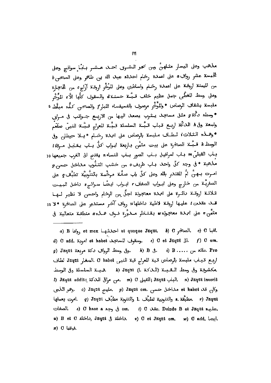 مذهب وعلى اليسار مثلهنّ ومن نحو الشرق أحد عشر بابا سواذج وعلى الخمسة عشر رواق [1] على اعمدة رخام أحدثه عبد الله بن طاهر وعلى الصحن [2] من الميمنة اروقة على اعمدة رخام وأساطين وعلى المؤخّر اروقة آزاج [3] من الحجارة وعلى وسط المغطى جمل عظيم خلف قبّة حسنة [4] والسقوف كلّها الّا [5] المؤخّر ملبسة بشقاق الرصاص والمؤخّر مرصوف بالفسيفساء الكبار [6] والصحن كلّه مبلّط وسطه دكّة [7] مثل مسجد يثرب يصعد اليها من الأربع جوانب في مراق واسعة وفي [8] الدكّة اربع قباب قبّة السلسلة قبّة المعراج قبّة النبيّ صلى الله عليه وسلم وهذه الثلاث [9] لطاف ملبسة بالرصاص على اعمدة رخام بلا حيطان وفي الوسط [10] قبّة الصخرة على بيت مثمّن بأربعة أبواب كلّ باب يقابل مرقاة [11] باب القبليّ [12] باب إسرافيل باب الصور باب النساء [13] يفتح الى الغرب جميعها مذهبة في وجه كلّ واحد باب ظريف [14] من خشب التنّوب مداخل حسن [15] أمرت بهنّ امّ المقتدر باللَّه وعلى كلّ باب صفّة مرخّمة بالتنّوبيّة تطبّق [16] على الصفريّة من خارج وعلى أبواب الصفاف [17] أبواب أيضا سواذج [18] داخل البيت ثلاثة اروقة دائرة على اعمدة معجونة اجلّ من الرخام وأحسن لا نظير لها قد عقدت [19] عليها اروقة لاطية داخلها [20] رواق آخر مستدير على الصخرة لا مثمّن [21] على اعمدة معجونة [22] بقناطر مدوّرة فوق هذه [23] منطقة متعالية في