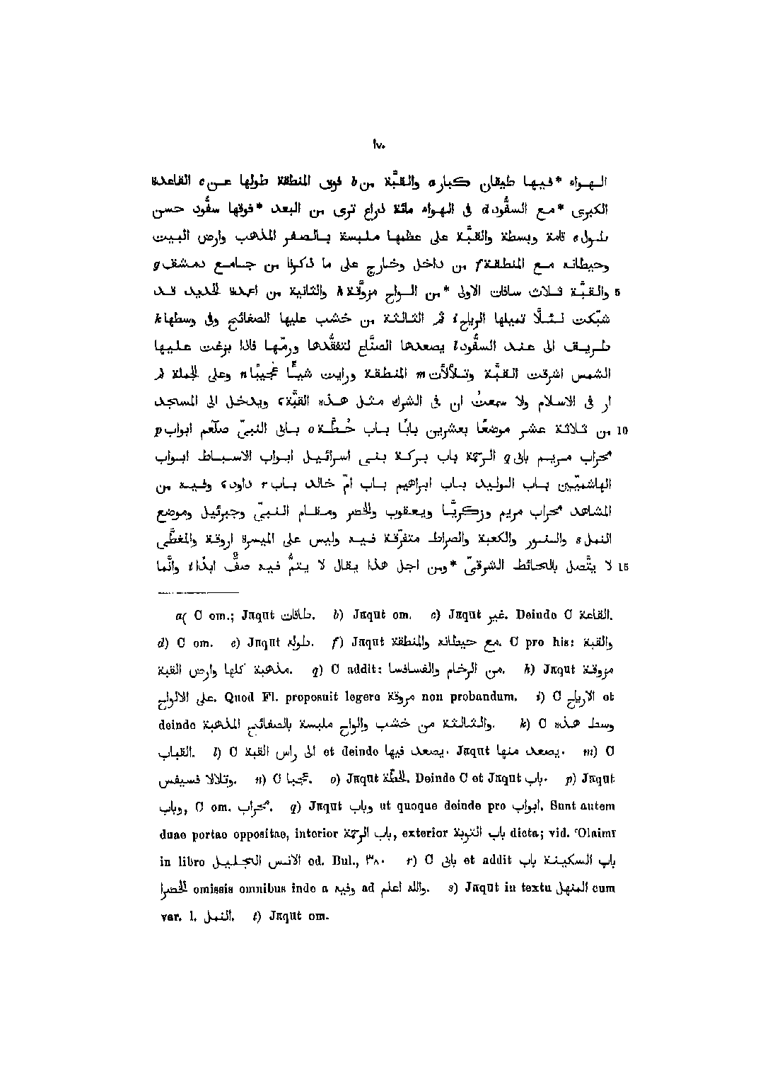 الهواء فيها طيقان كبار [1] والقبّة من [2] فوق المنطقة طولها عن [3] القاعدة الكبرى مع السفّود [4] في الهواء مائة ذراع ترى من البعد فوقها سفّود حسن طول [5] قامة وبسطة والقبّة على عظمها ملبسة بالصفر المذهب وارض البيت وحيطانه مع المنطقة [6] من داخل وخارج على ما ذكرنا من جامع دمشق [7] والقبّة ثلاث سافات الاولى من ألواح مزوّقة [8] والثانية من اعمدة الحديد قد شبّكت لئلّا تميلها الرياح [9] ثم الثالثة من خشب عليها الصفائح وفي وسطها [10] طريق الى عند السفّود [11] يصعدها الصنّاع لتفقّدها ورمّها فإذا بزغت عليها الشمس أشرقت القبّة وتلألأت [12] المنطقة ورأيت شيئا عجيبا [13] وعلى الجملة لم أر في الإسلام ولا سمعت ان في الشرك مثل هذه القبّة، ويدخل الى المسجد من ثلاثة عشر موضعا بعشرين بابا باب حطّة [14] بابي النبيّ صلى الله عليه وسلم أبواب [15] محراب مريم بابي [16] الرحمة باب بركة بنى إسرائيل أبواب الأسباط أبواب الهاشميّين باب الوليد باب إبراهيم باب امّ خالد باب [17] داود، وفيه من المشاهد محراب مريم وزكريّا ويعقوب والخضر ومقام النبيّ وجبرئيل وموضع النمل [18] والنور والكعبة والصراط متفرّقة فيه وليس على الميسرة اروقة والمغطّى لا يتّصل بالحائط الشرقىّ ومن أجل هذا يقال لا يتمّ فيه صفّ ابدا [19] وانّما